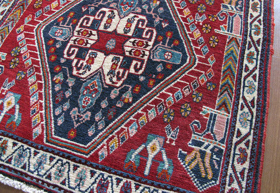 枯れた色合いとカシュガイの伝統柄が味わいあるアンティクオールドのカシュガイ絨毯。デザイン性と温かみのある素朴な雰囲気に気分がなごみます。カシュガイ絨毯の厚みは、だいたい10ミリ前後で、細手の糸のさらりとした毛足感。玄関や足元マットのほか、座布団や壁飾りとして、インテリア上級者に取り入れて頂きたいアイテムです。こちらは、丁寧な織りです。