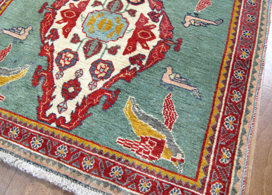 枯れた色合いとカシュガイの伝統柄が味わいあるアンティクオールドのカシュガイ絨毯。デザイン性と温かみのある素朴な雰囲気に気分がなごみます。カシュガイ絨毯の厚みは、だいたい10ミリ前後で、細手の糸のさらりとした毛足感。玄関や足元マットのほか、座布団や壁飾りとして、インテリア上級者に取り入れて頂きたいアイテムです。こちらは、織りの細かな美しい作りです。