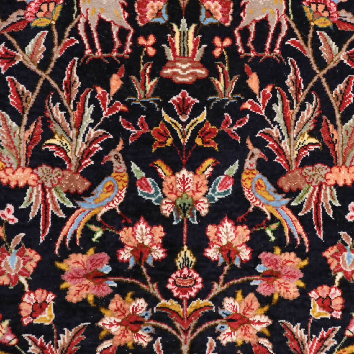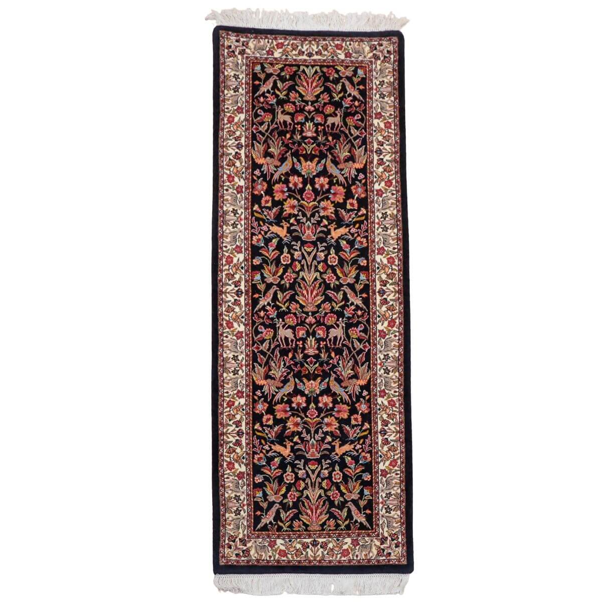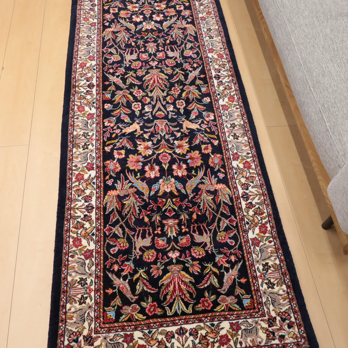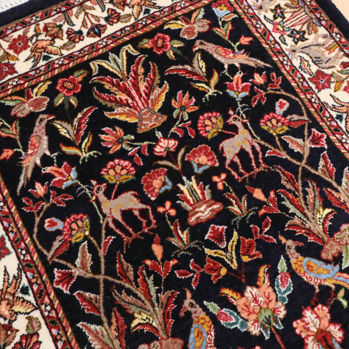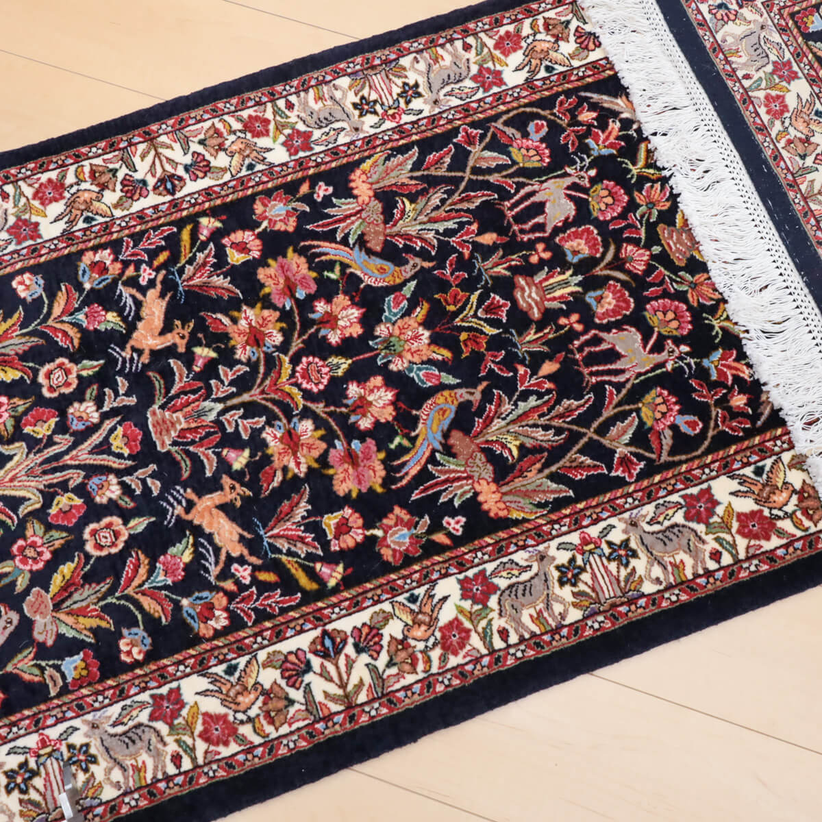 デザインの魅力 黒地に赤やピンク、黄金色の花々が対称的に配置された、格調高いペルシャンガーデンのデザインです。飛び鳥や草木が交互に映え、古典美と洗練された構成が織り成す芸術的な表現となっています。廊下やリビング前に敷くと、上質な雰囲気が引き立ちます。