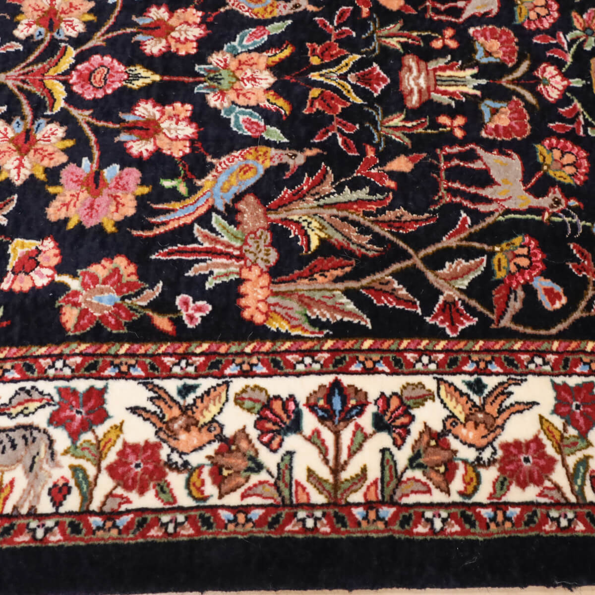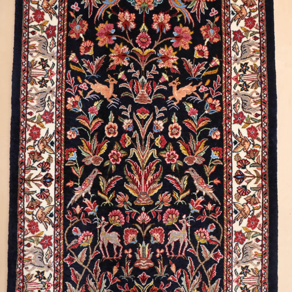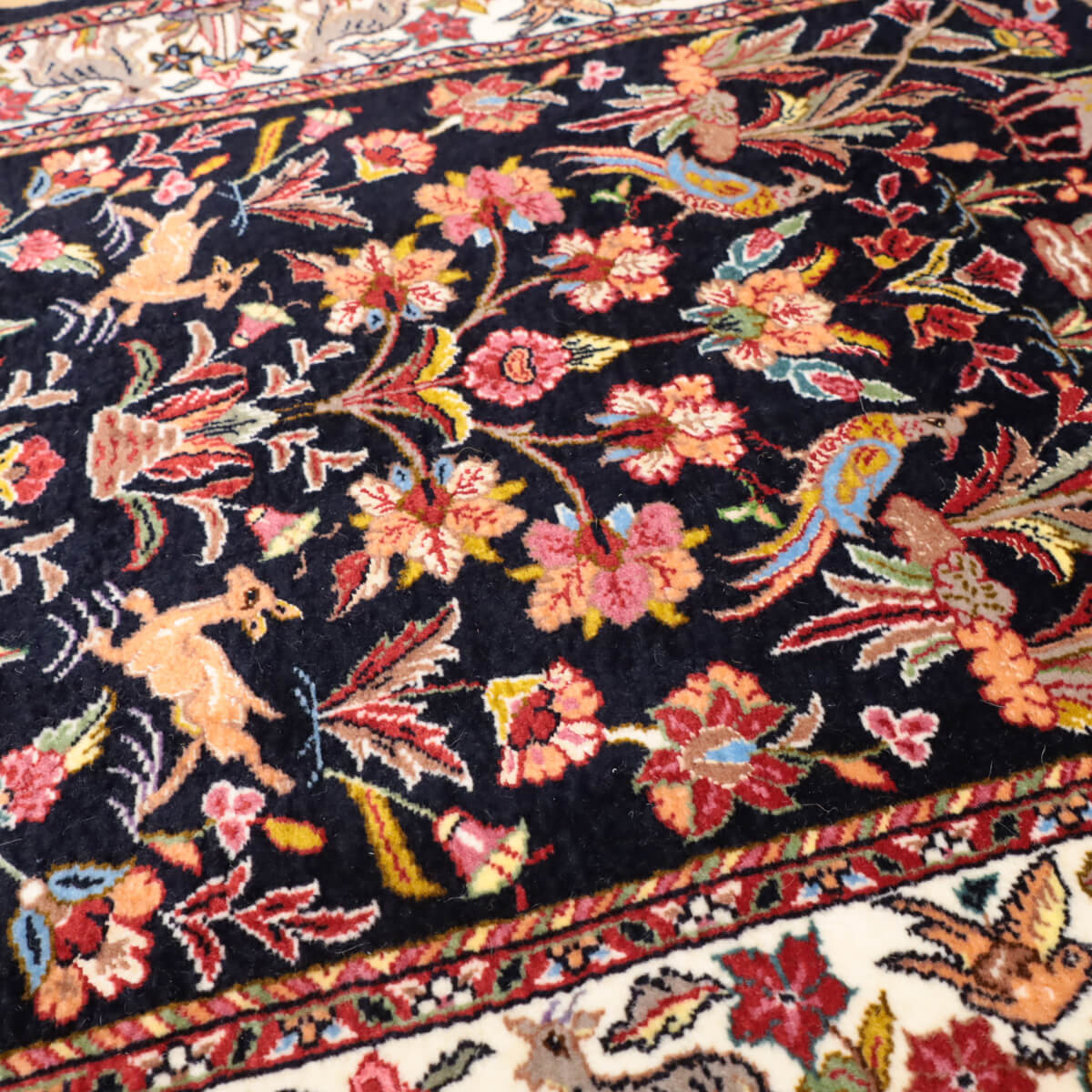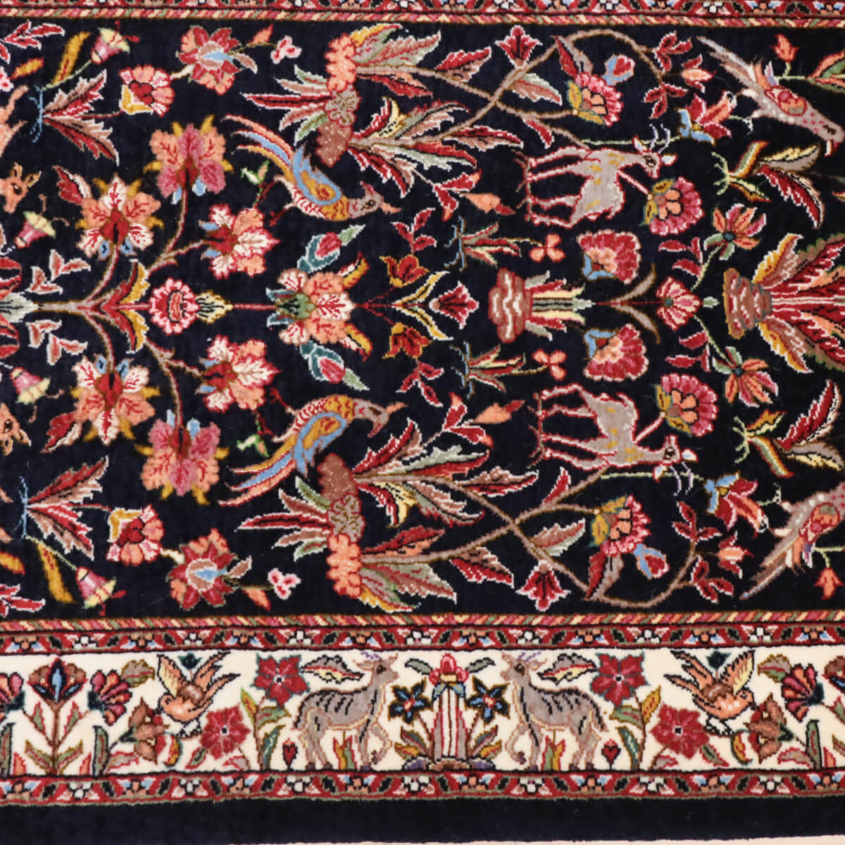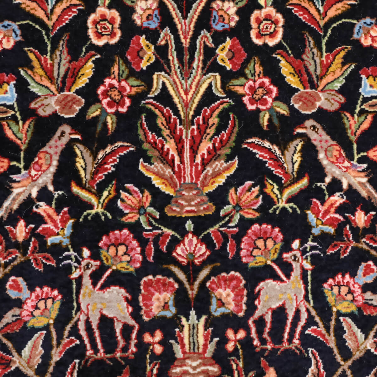 デザインの魅力 黒地に赤やピンク、黄金色の花々が対称的に配置された、格調高いペルシャンガーデンのデザインです。飛び鳥や草木が交互に映え、古典美と洗練された構成が織り成す芸術的な表現となっています。廊下やリビング前に敷くと、上質な雰囲気が引き立ちます。