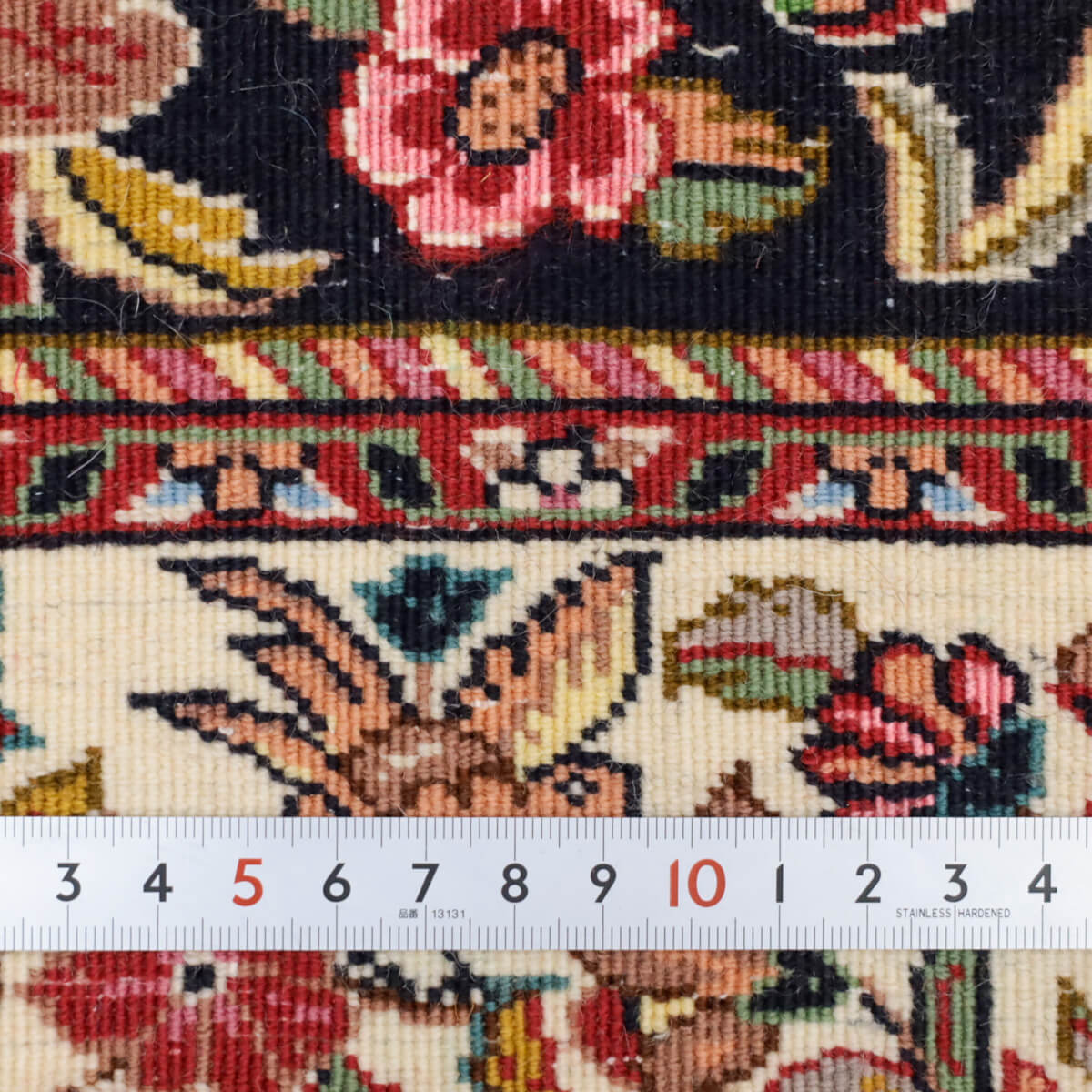 色 深い紺黒を基調に、サンゴピンク、深紅、黄金色、薄緑、水色が調和した豊かな配色です。生成り色の枠取りが全体を引き締め、どのような洋風・和風のお部屋にも落ち着きを与え、調和します。