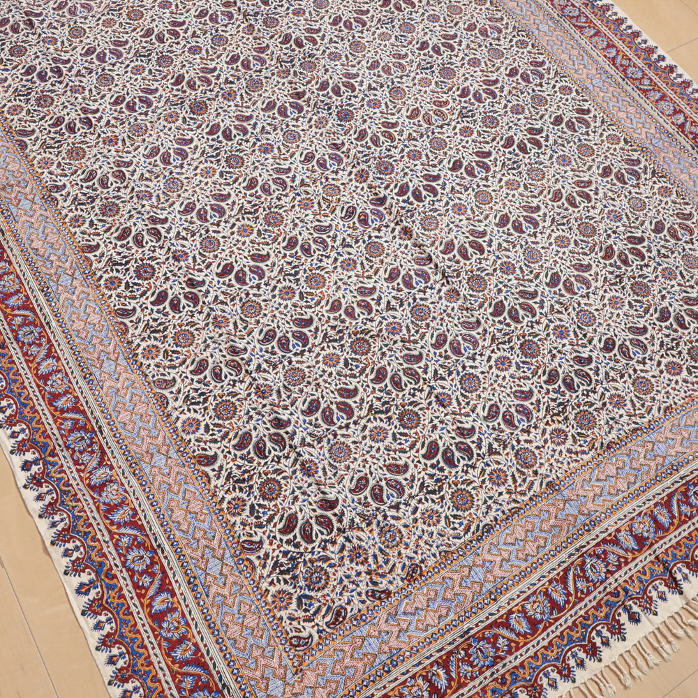 ペルシャ更紗(ガラムカール)は、年季の入った幾つもの手彫りの木型を使って、型を変え、色を変えて、何度も何度も手作業で型押しして染められます。イランの古都イスハファーンの工房で、職人さんが一枚ずつ丁寧に染め付け、まわりの房を手で撚り合わせて、全てハンドメイドで仕上げていきます。機械で一度に高速プリントされる布とは違う、手間のかけられた手仕事の職人技をぜひ楽しんでください。手作りの為、押し染めで染料が飛んだり擦れたりした部分がある場合もございます。程度の大きなものはコメントをつけておりますが、商品特性となります。