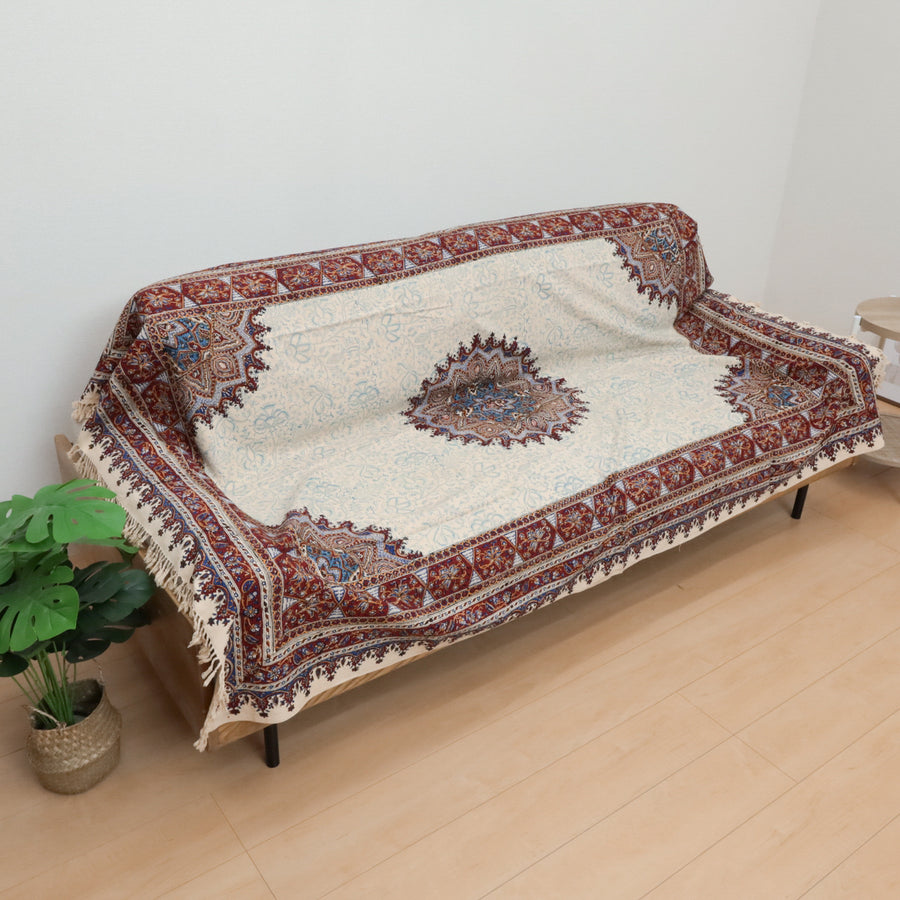 唐草模様はペルシャからシルクロードを伝って日本に伝来したと言われますが、エキゾチックなペイズリー柄はどことなく懐かしいレトロな雰囲気も持っていて思いのほか、インテリアに良く馴染みます。生地は、しっかりと厚みのある木綿100%の一枚布で、しなやかで柔らかな質感。シワになりにくいので、ソファカバーやベッドカバー、また、カーテンのような間仕切りに使ったりと大変使いやすいインテリアファブリックで、これ一枚でお部屋の印象がぐっと素敵になります。