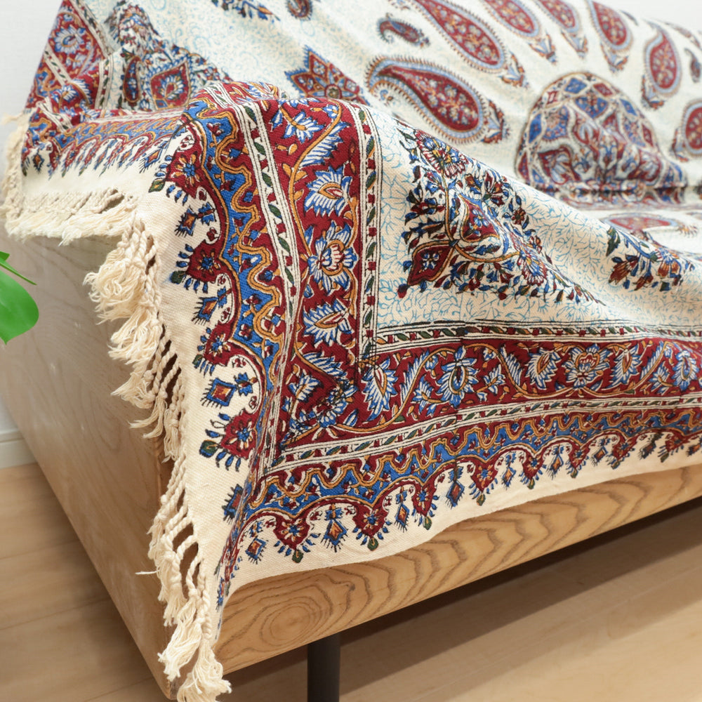 唐草模様はペルシャからシルクロードを伝って日本に伝来したと言われますが、エキゾチックなペイズリー柄はどことなく懐かしいレトロな雰囲気も持っていて思いのほか、インテリアに良く馴染みます。生地は、しっかりと厚みのある木綿100%の一枚布で、しなやかで柔らかな質感。シワになりにくいので、ソファカバーやベッドカバー、また、カーテンのような間仕切りに使ったりと大変使いやすいインテリアファブリックで、これ一枚でお部屋の印象がぐっと素敵になります。