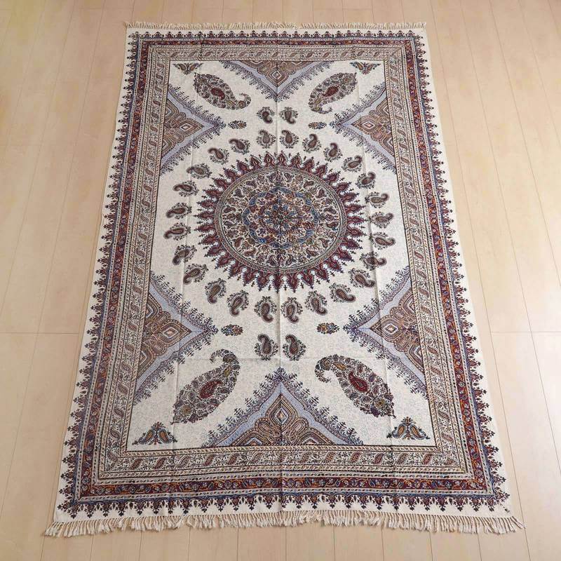唐草模様はペルシャからシルクロードを伝って日本に伝来したと言われますが、エキゾチックなペイズリー柄はどことなく懐かしいレトロな雰囲気も持っていて思いのほか、インテリアに良く馴染みます。生地は、しっかりと厚みのある木綿100%の一枚布で、しなやかで柔らかな質感。シワになりにくいので、ソファカバーやベッドカバー、また、カーテンのような間仕切りに使ったりと大変使いやすいインテリアファブリックで、これ一枚でお部屋の印象がぐっと素敵になります。