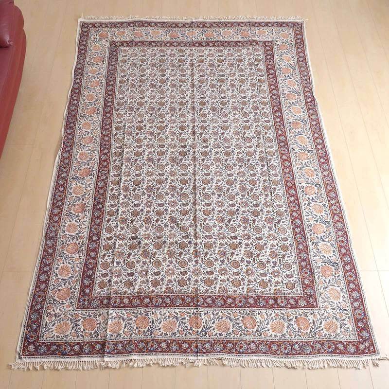 ペルシャ更紗(ガラムカール)は、年季の入った幾つもの手彫りの木型を使って、型を変え、色を変えて、何度も何度も手作業で型押しして染められます。イランの古都イスハファーンの工房で、職人さんが一枚ずつ丁寧に染め付け、まわりの房を手で撚り合わせて、全てハンドメイドで仕上げていきます。機械で一度に高速プリントされる布とは違う、手間のかけられた手仕事の職人技をぜひ楽しんでください。手作りの為、押し染めで染料が飛んだり擦れたりした部分がある場合もございます。程度の大きなものはコメントをつけておりますが、商品特性となります。