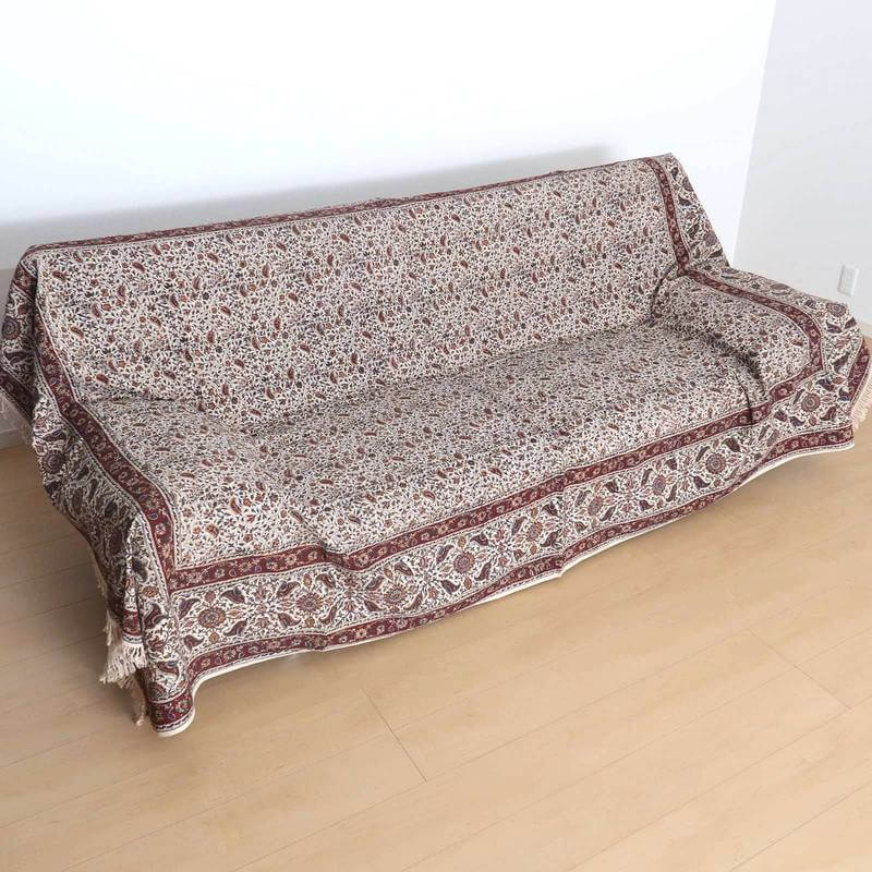 唐草模様はペルシャからシルクロードを伝って日本に伝来したと言われますが、エキゾチックなペイズリー柄はどことなく懐かしいレトロな雰囲気も持っていて思いのほか、インテリアに良く馴染みます。生地は、しっかりと厚みのある木綿100%の一枚布で、しなやかで柔らかな質感。シワになりにくいので、ソファカバーやベッドカバー、また、カーテンのような間仕切りに使ったりと大変使いやすいインテリアファブリックで、これ一枚でお部屋の印象がぐっと素敵になります。