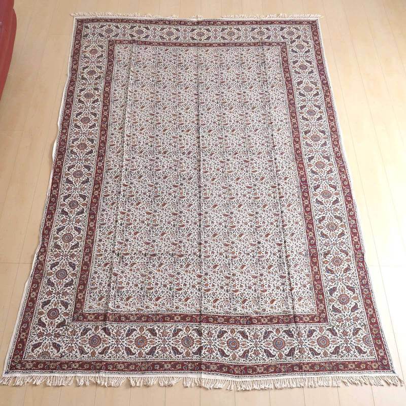 ペルシャ更紗(ガラムカール)は、年季の入った幾つもの手彫りの木型を使って、型を変え、色を変えて、何度も何度も手作業で型押しして染められます。イランの古都イスハファーンの工房で、職人さんが一枚ずつ丁寧に染め付け、まわりの房を手で撚り合わせて、全てハンドメイドで仕上げていきます。機械で一度に高速プリントされる布とは違う、手間のかけられた手仕事の職人技をぜひ楽しんでください。手作りの為、押し染めで染料が飛んだり擦れたりした部分がある場合もございます。程度の大きなものはコメントをつけておりますが、商品特性となります。