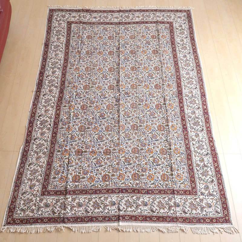 ペルシャ更紗(ガラムカール)は、年季の入った幾つもの手彫りの木型を使って、型を変え、色を変えて、何度も何度も手作業で型押しして染められます。イランの古都イスハファーンの工房で、職人さんが一枚ずつ丁寧に染め付け、まわりの房を手で撚り合わせて、全てハンドメイドで仕上げていきます。機械で一度に高速プリントされる布とは違う、手間のかけられた手仕事の職人技をぜひ楽しんでください。手作りの為、押し染めで染料が飛んだり擦れたりした部分がある場合もございます。程度の大きなものはコメントをつけておりますが、商品特性となります。
