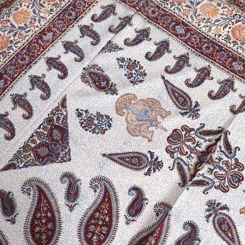 唐草模様はペルシャからシルクロードを伝って日本に伝来したと言われますが、エキゾチックなペイズリー柄はどことなく懐かしいレトロな雰囲気も持っていて思いのほか、インテリアに良く馴染みます。生地は、しっかりと厚みのある木綿100%の一枚布で、しなやかで柔らかな質感。シワになりにくいので、ソファカバーやベッドカバー、また、カーテンのような間仕切りに使ったりと大変使いやすいインテリアファブリックで、これ一枚でお部屋の印象がぐっと素敵になります。