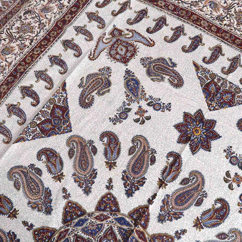 ペルシャ更紗(ガラムカール)は、年季の入った幾つもの手彫りの木型を使って、型を変え、色を変えて、何度も何度も手作業で型押しして染められます。イランの古都イスハファーンの工房で、職人さんが一枚ずつ丁寧に染め付け、まわりの房を手で撚り合わせて、全てハンドメイドで仕上げていきます。機械で一度に高速プリントされる布とは違う、手間のかけられた手仕事の職人技をぜひ楽しんでください。手作りの為、押し染めで染料が飛んだり擦れたりした部分がある場合もございます。程度の大きなものはコメントをつけておりますが、商品特性となります。