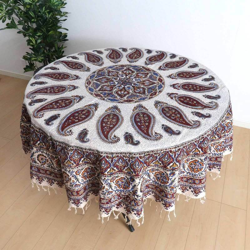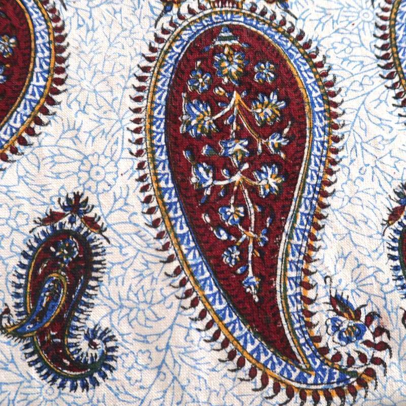 唐草模様はペルシャからシルクロードを伝って日本に伝来したと言われますが、エキゾチックなペイズリー柄はどことなく懐かしいレトロな雰囲気も持っていて思いのほか、インテリアに良く馴染みます。生地は、しっかりと厚みのある木綿100%の一枚布で、しなやかで柔らかな質感。シワになりにくいので、ソファカバーやベッドカバー、また、カーテンのような間仕切りに使ったりと大変使いやすいインテリアファブリックで、これ一枚でお部屋の印象がぐっと素敵になります。
