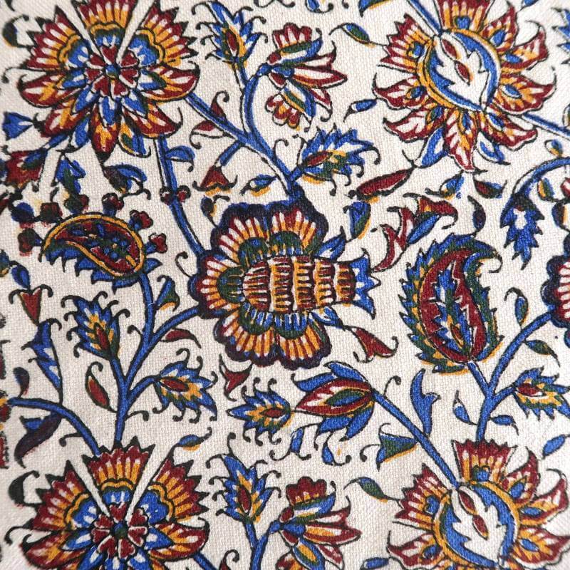 ペルシャ更紗(ガラムカール)は、年季の入った幾つもの手彫りの木型を使って、型を変え、色を変えて、何度も何度も手作業で型押しして染められます。イランの古都イスハファーンの工房で、職人さんが一枚ずつ丁寧に染め付け、まわりの房を手で撚り合わせて、全てハンドメイドで仕上げていきます。機械で一度に高速プリントされる布とは違う、手間のかけられた手仕事の職人技をぜひ楽しんでください。手作りの為、押し染めで染料が飛んだり擦れたりした部分がある場合もございます。程度の大きなものはコメントをつけておりますが、商品特性となります。