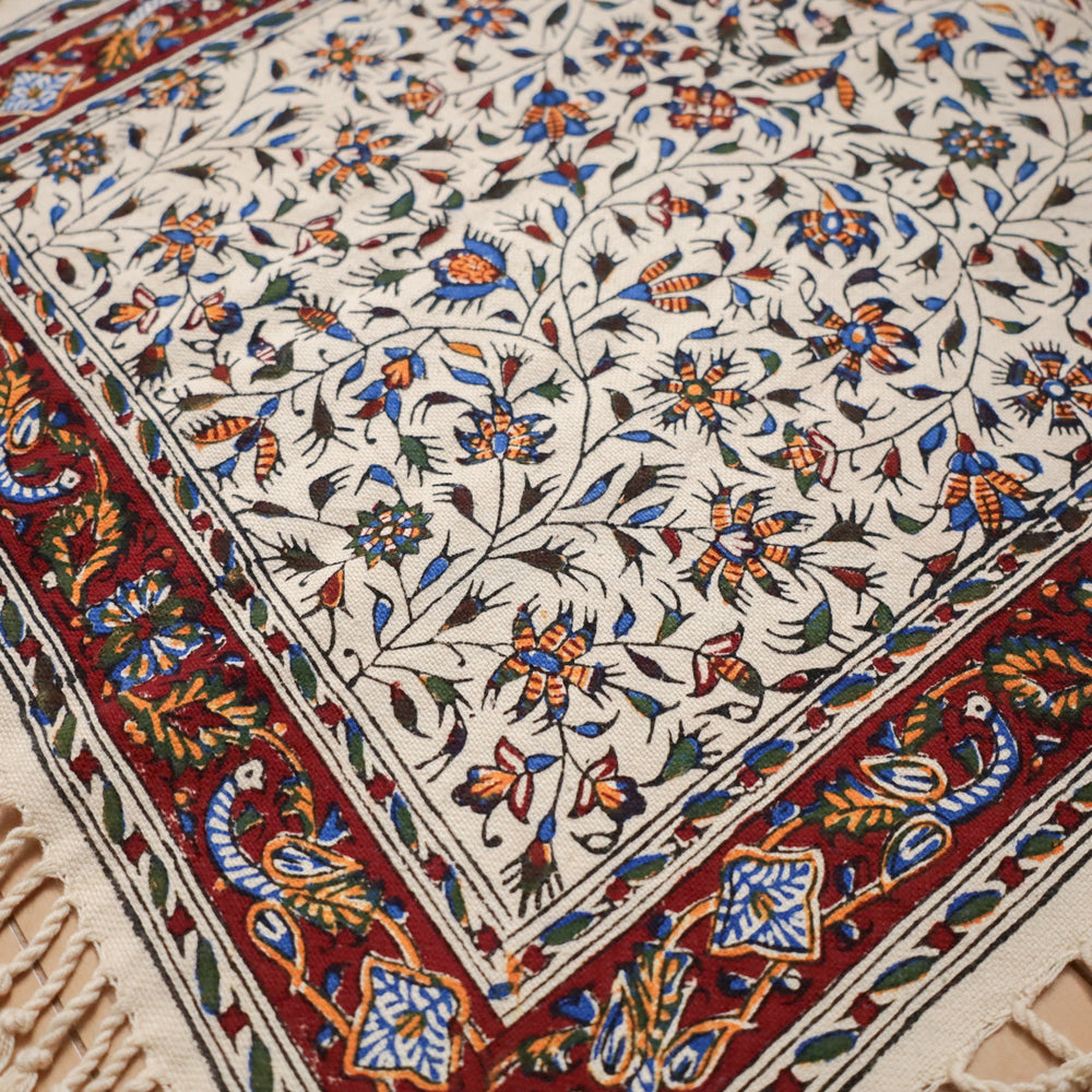 ペルシャ更紗(ガラムカール)は、年季の入った幾つもの手彫りの木型を使って、型を変え、色を変えて、何度も何度も手作業で型押しして染められます。イランの古都イスハファーンの工房で、職人さんが一枚ずつ丁寧に染め付け、まわりの房を手で撚り合わせて、全てハンドメイドで仕上げていきます。機械で一度に高速プリントされる布とは違う、手間のかけられた手仕事の職人技をぜひ楽しんでください。手作りの為、押し染めで染料が飛んだり擦れたりした部分がある場合もございます。程度の大きなものはコメントをつけておりますが、商品特性となります。