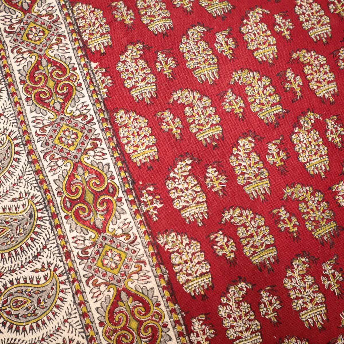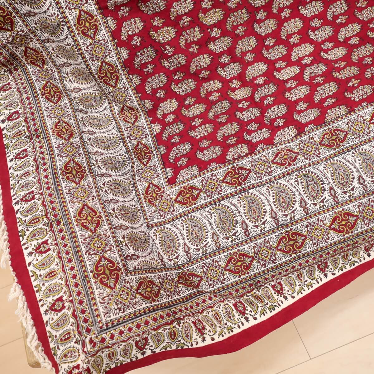ペルシャ更紗(ガラムカール)は、年季の入った幾つもの手彫りの木型を使って、型を変え、色を変えて、何度も何度も手作業で型押しして染められます。イランの古都イスハファーンの工房で、職人さんが一枚ずつ丁寧に染め付け、まわりの房を手で撚り合わせて、全てハンドメイドで仕上げていきます。機械で一度に高速プリントされる布とは違う、手間のかけられた手仕事の職人技をぜひ楽しんでください。手作りの為、押し染めで染料が飛んだり擦れたりした部分がある場合もございます。程度の大きなものはコメントをつけておりますが、商品特性となります。