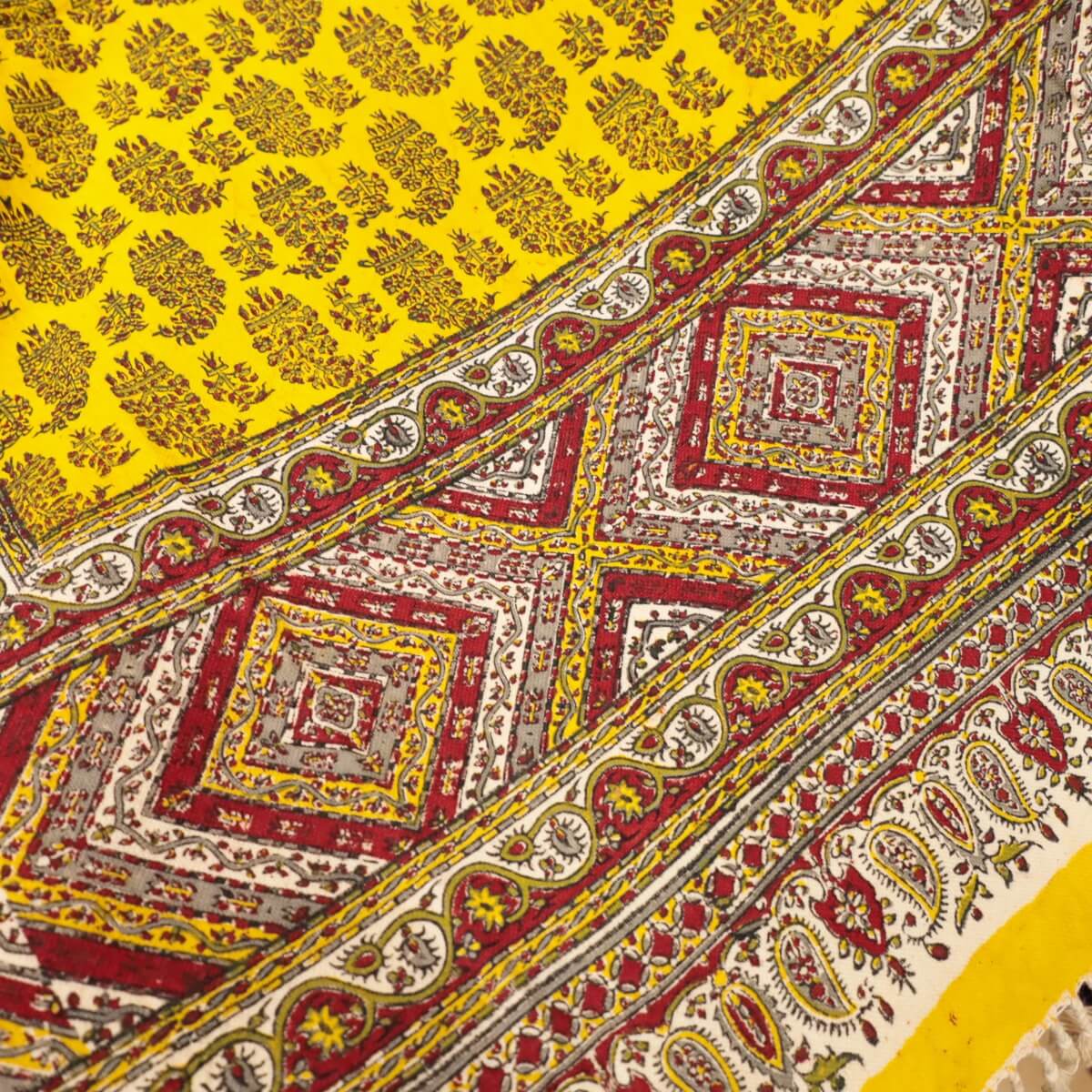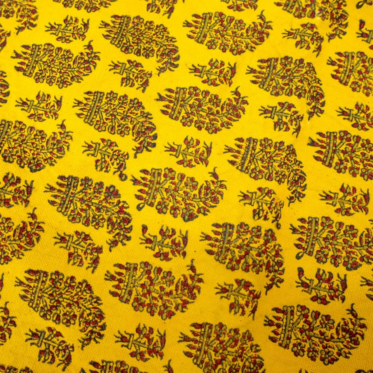 ペルシャ更紗(ガラムカール)は、年季の入った幾つもの手彫りの木型を使って、型を変え、色を変えて、何度も何度も手作業で型押しして染められます。イランの古都イスハファーンの工房で、職人さんが一枚ずつ丁寧に染め付け、まわりの房を手で撚り合わせて、全てハンドメイドで仕上げていきます。機械で一度に高速プリントされる布とは違う、手間のかけられた手仕事の職人技をぜひ楽しんでください。手作りの為、押し染めで染料が飛んだり擦れたりした部分がある場合もございます。程度の大きなものはコメントをつけておりますが、商品特性となります。