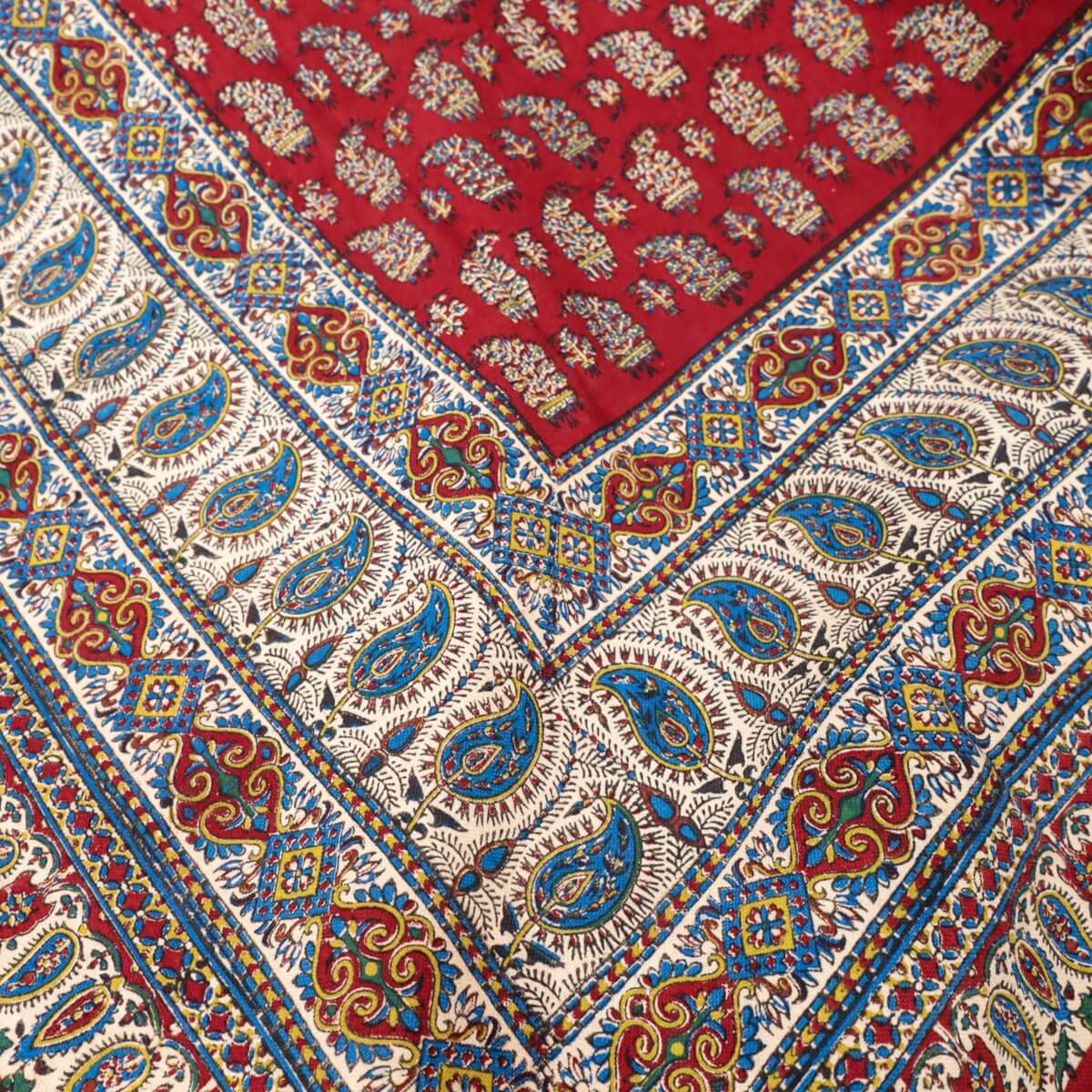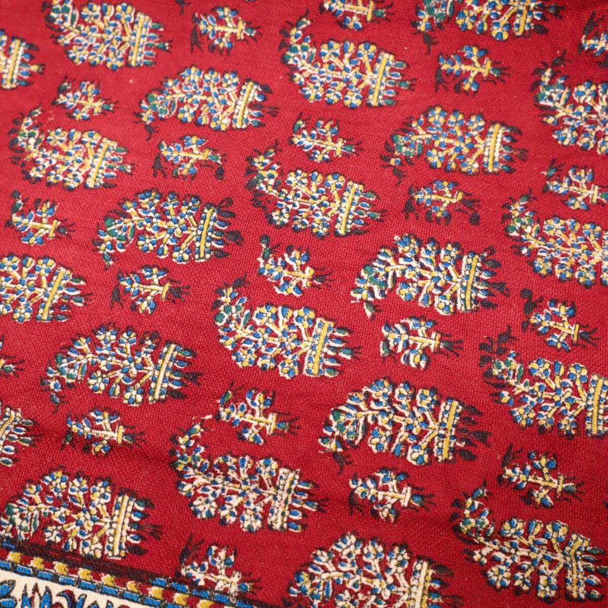 ペルシャ更紗(ガラムカール)は、年季の入った幾つもの手彫りの木型を使って、型を変え、色を変えて、何度も何度も手作業で型押しして染められます。イランの古都イスハファーンの工房で、職人さんが一枚ずつ丁寧に染め付け、まわりの房を手で撚り合わせて、全てハンドメイドで仕上げていきます。機械で一度に高速プリントされる布とは違う、手間のかけられた手仕事の職人技をぜひ楽しんでください。手作りの為、押し染めで染料が飛んだり擦れたりした部分がある場合もございます。程度の大きなものはコメントをつけておりますが、商品特性となります。