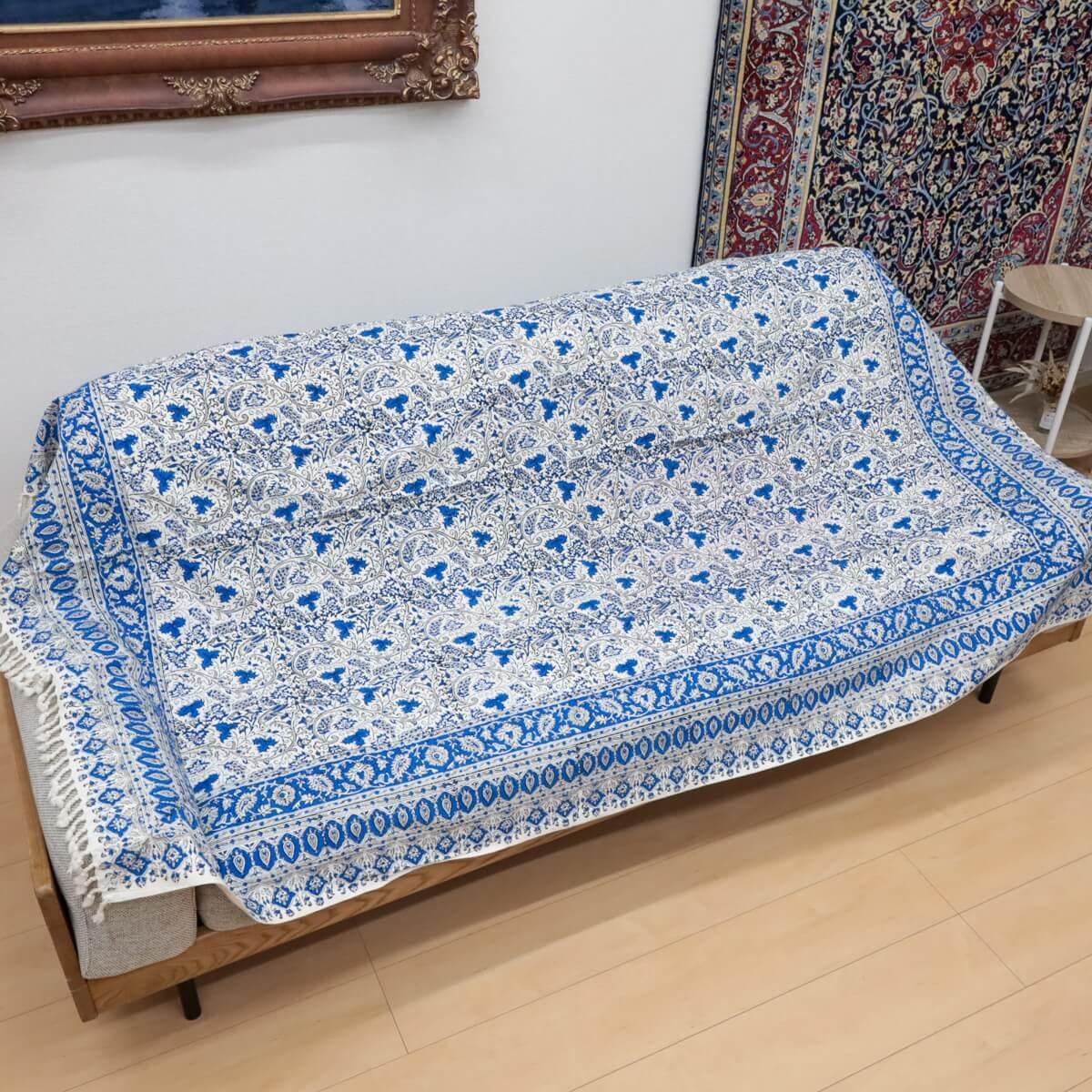唐草模様はペルシャからシルクロードを伝って日本に伝来したと言われますが、エキゾチックなペイズリー柄はどことなく懐かしいレトロな雰囲気も持っていて思いのほか、インテリアに良く馴染みます。生地は、しっかりと厚みのある木綿100%の一枚布で、しなやかで柔らかな質感。シワになりにくいので、ソファカバーやベッドカバー、また、カーテンのような間仕切りに使ったりと大変使いやすいインテリアファブリックで、これ一枚でお部屋の印象がぐっと素敵になります。