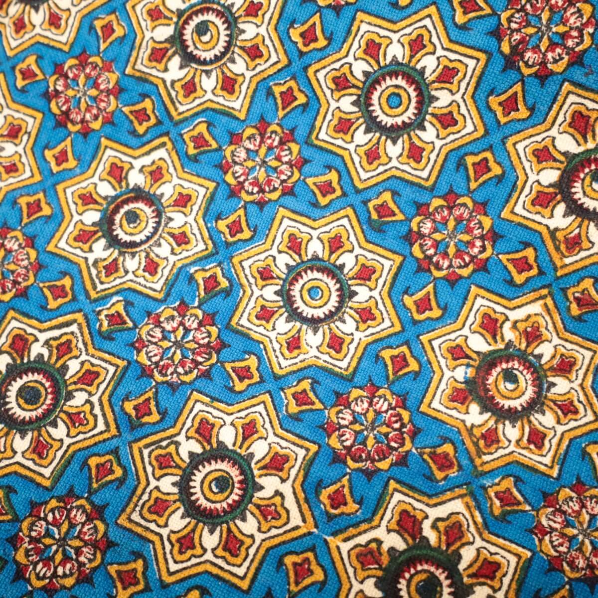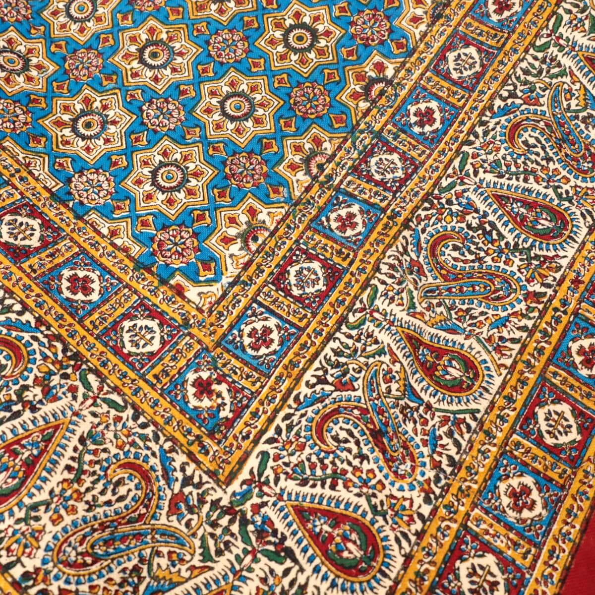 ペルシャ更紗(ガラムカール)は、年季の入った幾つもの手彫りの木型を使って、型を変え、色を変えて、何度も何度も手作業で型押しして染められます。イランの古都イスハファーンの工房で、職人さんが一枚ずつ丁寧に染め付け、まわりの房を手で撚り合わせて、全てハンドメイドで仕上げていきます。機械で一度に高速プリントされる布とは違う、手間のかけられた手仕事の職人技をぜひ楽しんでください。手作りの為、押し染めで染料が飛んだり擦れたりした部分がある場合もございます。程度の大きなものはコメントをつけておりますが、商品特性となります。