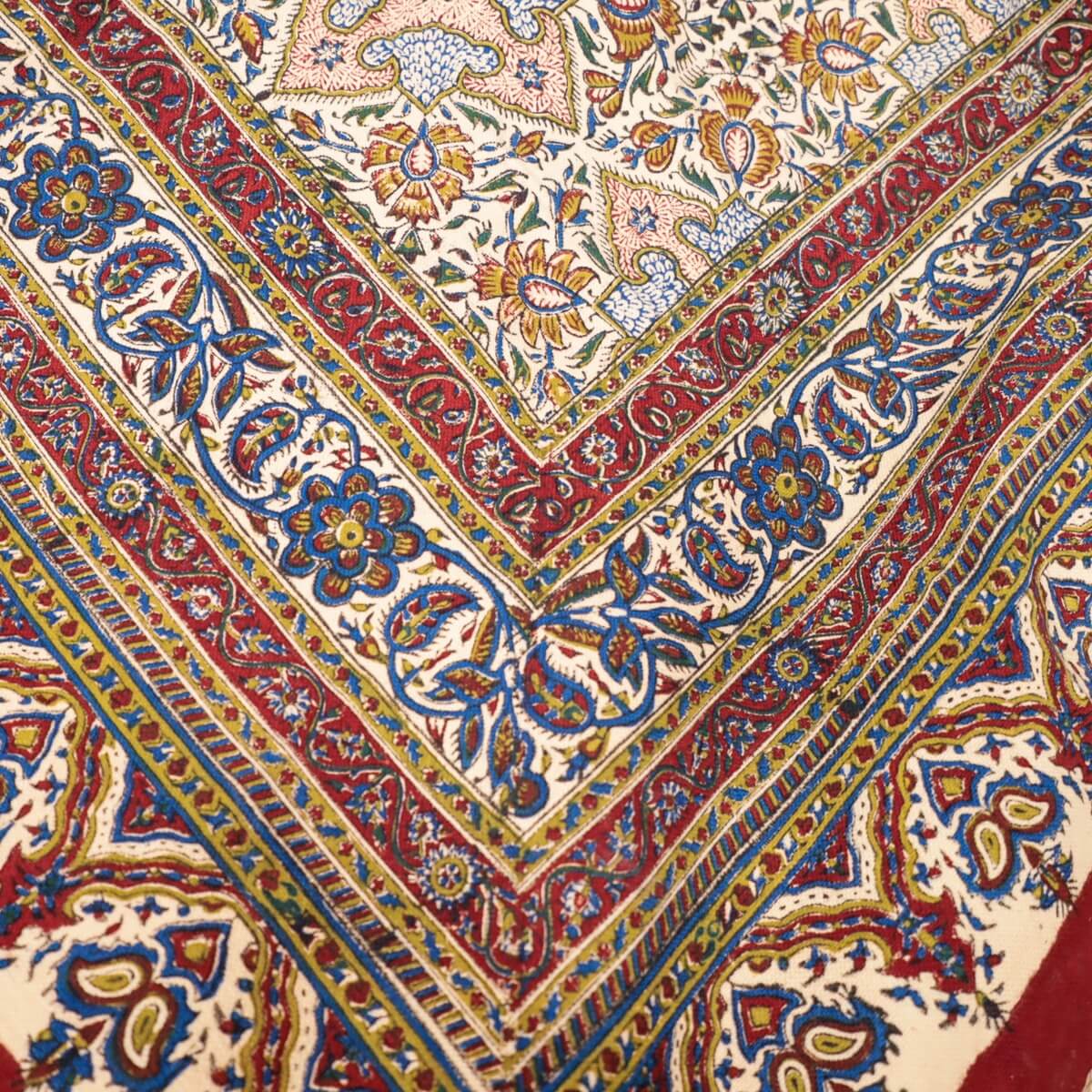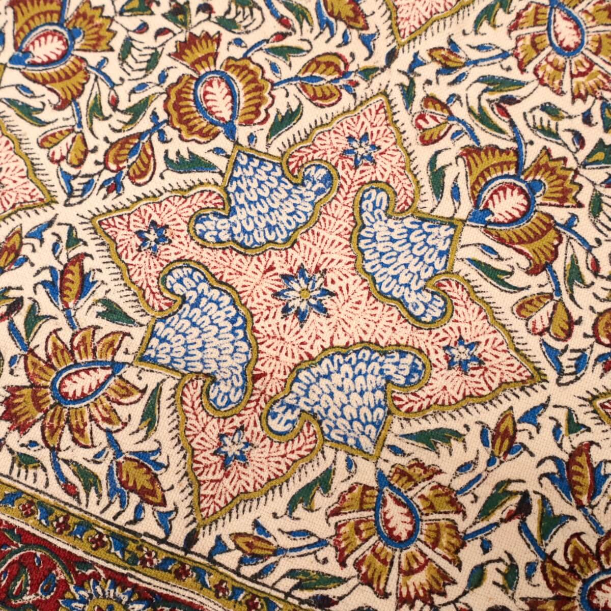 ペルシャ更紗(ガラムカール)は、年季の入った幾つもの手彫りの木型を使って、型を変え、色を変えて、何度も何度も手作業で型押しして染められます。イランの古都イスハファーンの工房で、職人さんが一枚ずつ丁寧に染め付け、まわりの房を手で撚り合わせて、全てハンドメイドで仕上げていきます。機械で一度に高速プリントされる布とは違う、手間のかけられた手仕事の職人技をぜひ楽しんでください。手作りの為、押し染めで染料が飛んだり擦れたりした部分がある場合もございます。程度の大きなものはコメントをつけておりますが、商品特性となります。