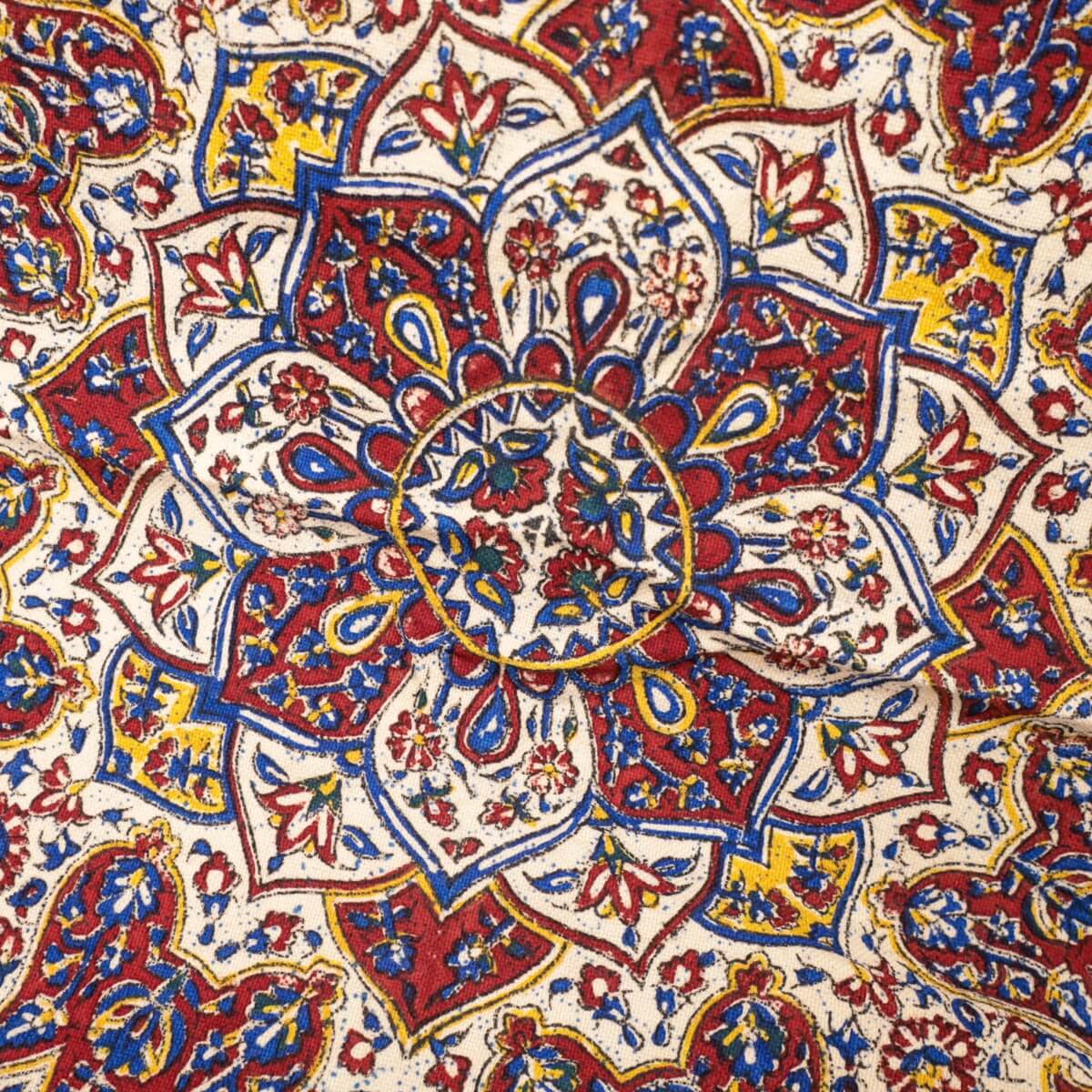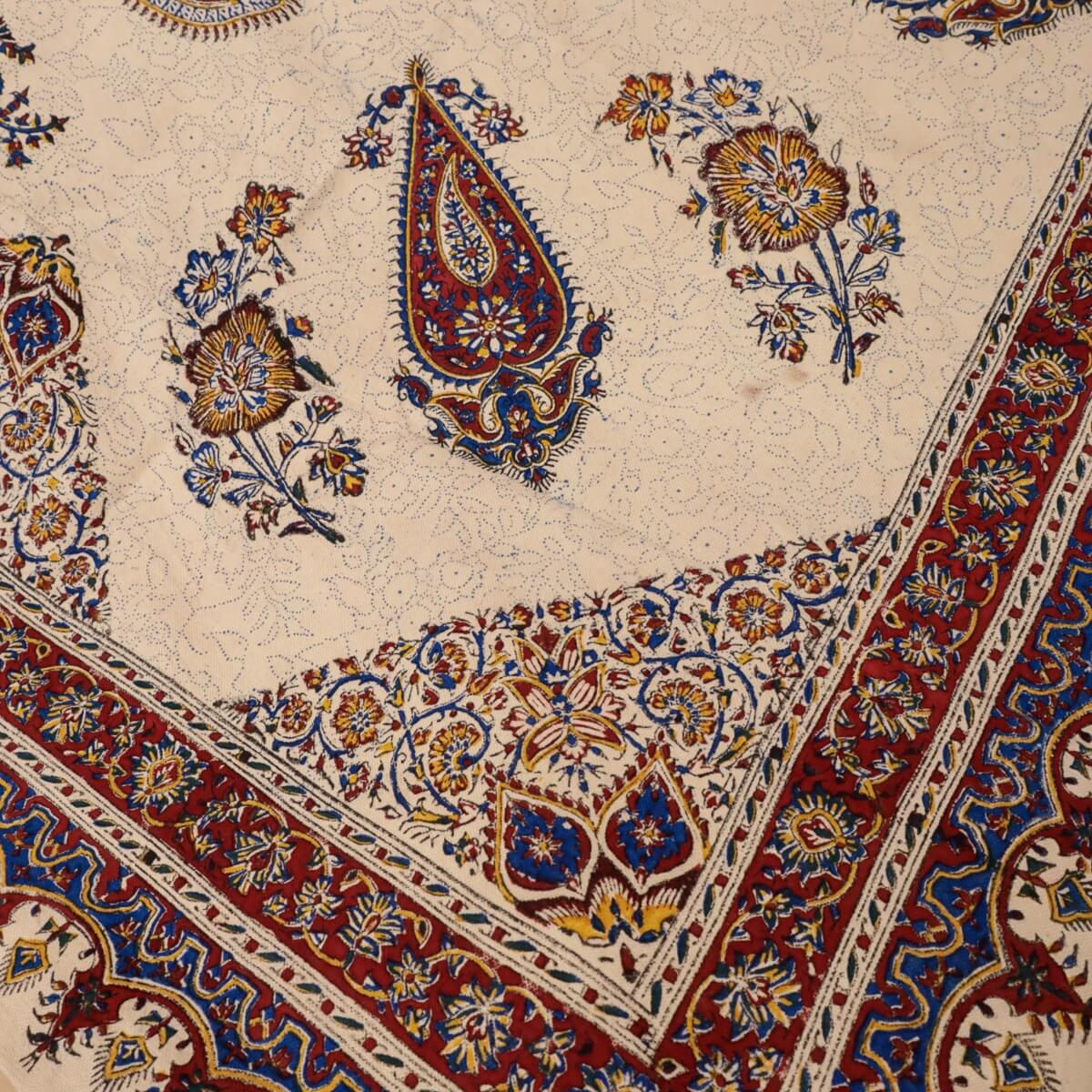 ペルシャ更紗(ガラムカール)は、年季の入った幾つもの手彫りの木型を使って、型を変え、色を変えて、何度も何度も手作業で型押しして染められます。イランの古都イスハファーンの工房で、職人さんが一枚ずつ丁寧に染め付け、まわりの房を手で撚り合わせて、全てハンドメイドで仕上げていきます。機械で一度に高速プリントされる布とは違う、手間のかけられた手仕事の職人技をぜひ楽しんでください。手作りの為、押し染めで染料が飛んだり擦れたりした部分がある場合もございます。程度の大きなものはコメントをつけておりますが、商品特性となります。