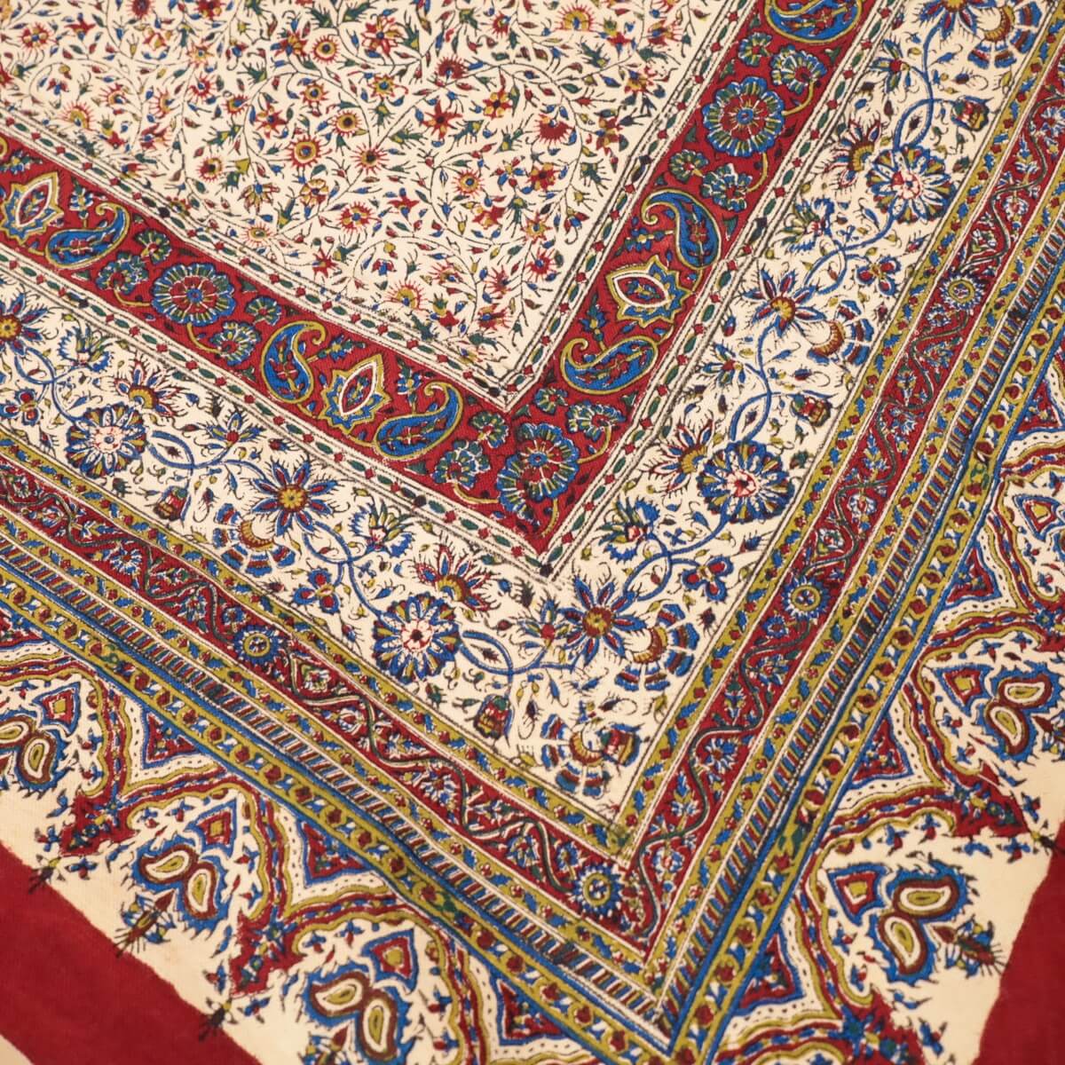 ペルシャ更紗(ガラムカール)は、年季の入った幾つもの手彫りの木型を使って、型を変え、色を変えて、何度も何度も手作業で型押しして染められます。イランの古都イスハファーンの工房で、職人さんが一枚ずつ丁寧に染め付け、まわりの房を手で撚り合わせて、全てハンドメイドで仕上げていきます。機械で一度に高速プリントされる布とは違う、手間のかけられた手仕事の職人技をぜひ楽しんでください。手作りの為、押し染めで染料が飛んだり擦れたりした部分がある場合もございます。程度の大きなものはコメントをつけておりますが、商品特性となります。