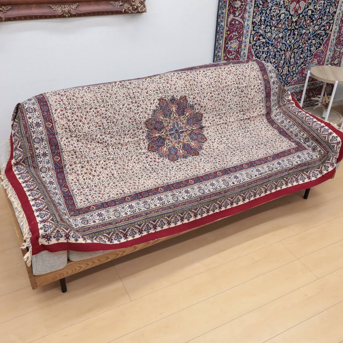 生地は、しっかりと厚みのある木綿100%の一枚布。しなやかで柔らかな質感で、シワになりにくく、ソファカバーやベッドカバー、カーテンのような間仕切りとしても使いやすいインテリアファブリックです。これ一枚で、お部屋の印象をさりげなく、そしてぐっと素敵に引き上げてくれます。
