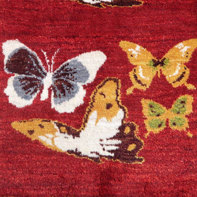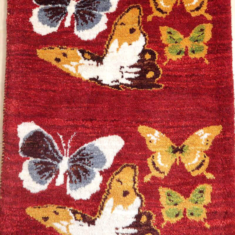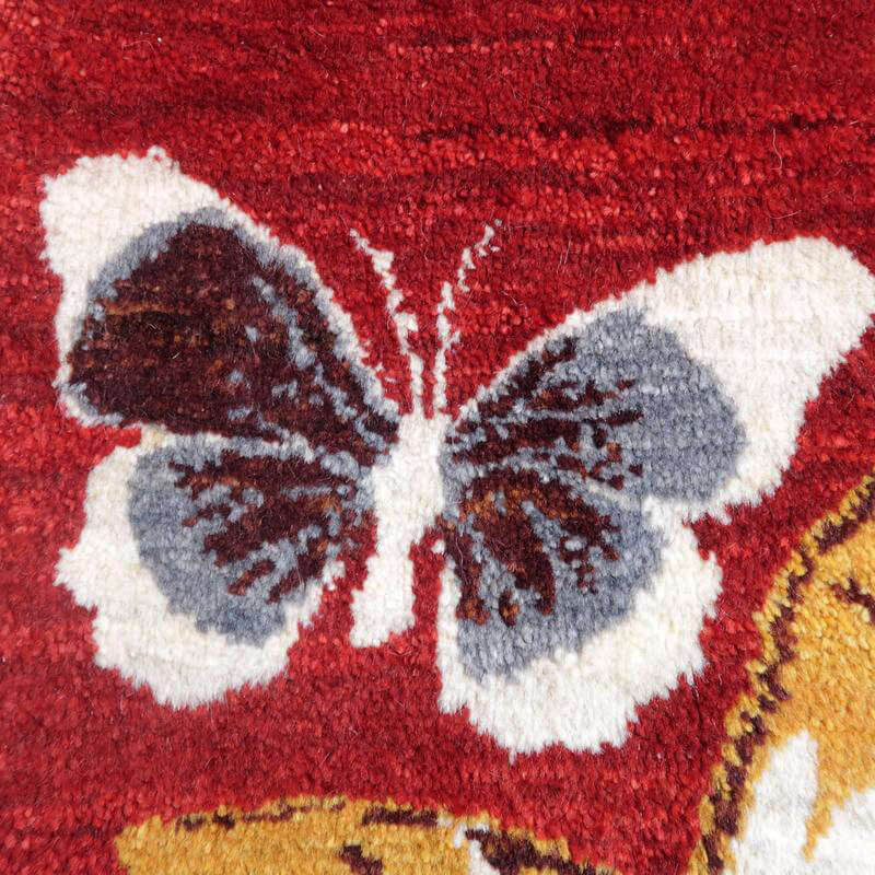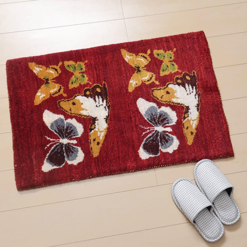 じんわり温かみのある綺麗な赤色をベースに、美しく舞う蝶々が描かれたモダンなデザイン。色彩豊かな蝶々の羽の色どりが明るく華やか。住まいに豊かさを添える上品でモダンなデザインは、玄関マットとして収まりが良いように、房を隠した作りに仕立てた当店オリジナルの特注仕様で、絵画を飾るようにも使って頂けます。