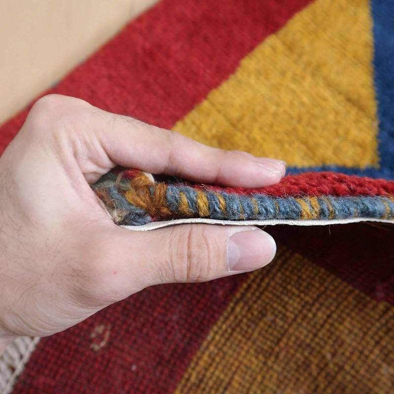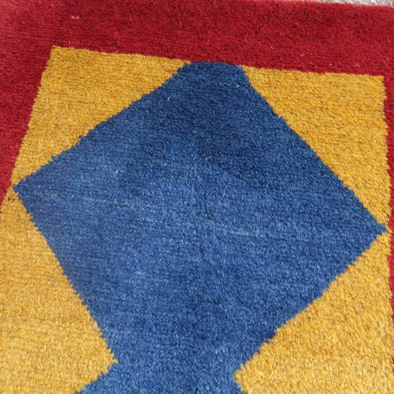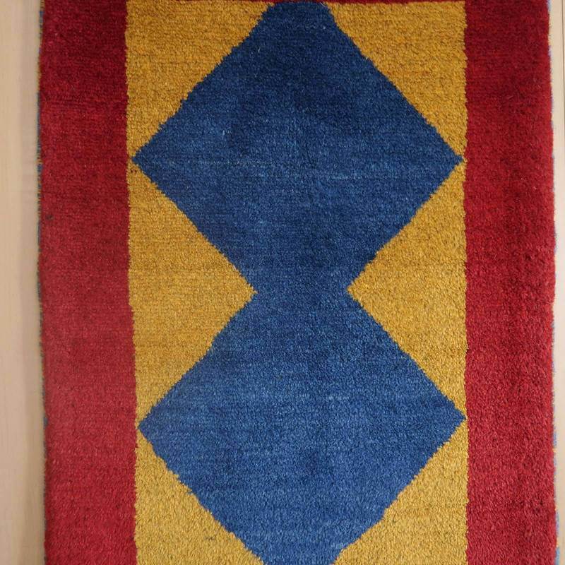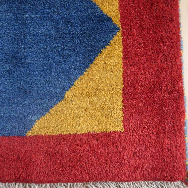 赤、黄色、青のくっきりとした色づかい。2つの大きなひし形が重なるように配置されたモダンなデザインのギャッベです。