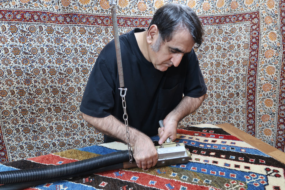 イラン出身のオーナーと店長は、四半世紀もの間に、延べ1億枚のペルシャ絨毯を直接触って吟味したり、検品したり、クリーニングや修理をしたりしてきました。
