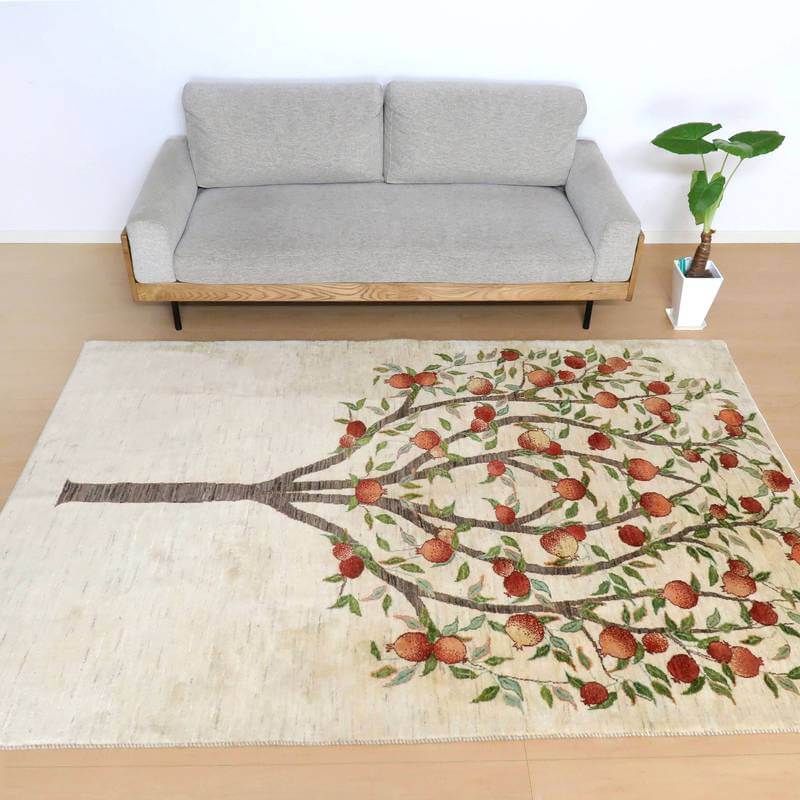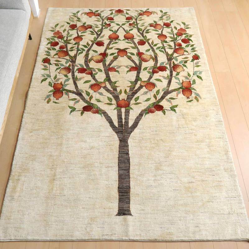 羊の毛色をそのまま活かした無染色の羊色がベースのナチュラルな風合い。イラン人にとって身近な食べ物である柘榴(ザクロ)は、昔から子宝の薬でもありますが、たわわに実をつけた大きな柘榴(ザクロ)のピクチャーデザインには、子孫繁栄の願いが込められています。赤ピンクの大きな実が明るい雰囲気です。