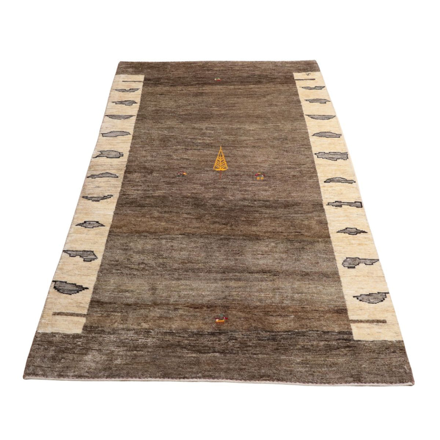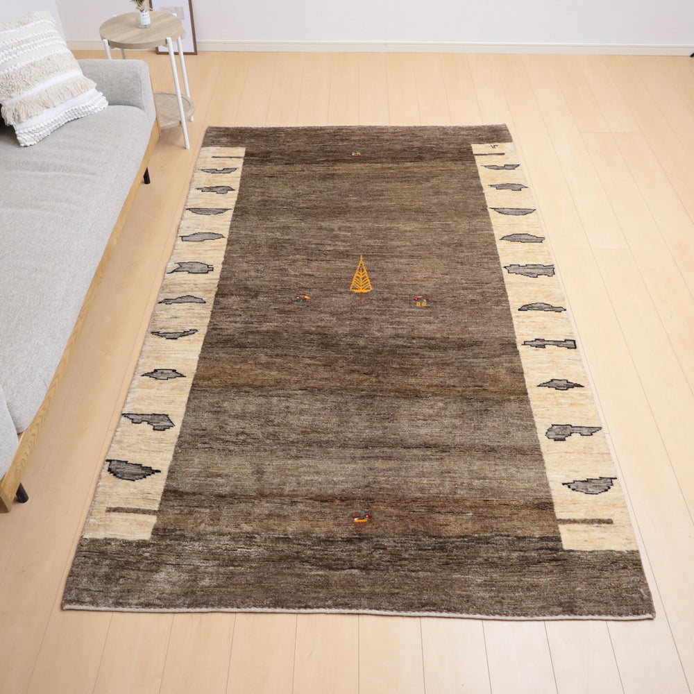 羊の毛色を活かした無染色の糸を使用して、ナチュラルな雰囲気がより大きく感じられます。ベージュの細かなグラデーションが美しい色のゆらぎとなったモダンなアートデザイン。中央に黄金の生命の木が入った可愛らしい図柄です。厚みは15、16ミリ程度、高密度でさらりとした踏み心地、艶めき感のあるウール素材です。