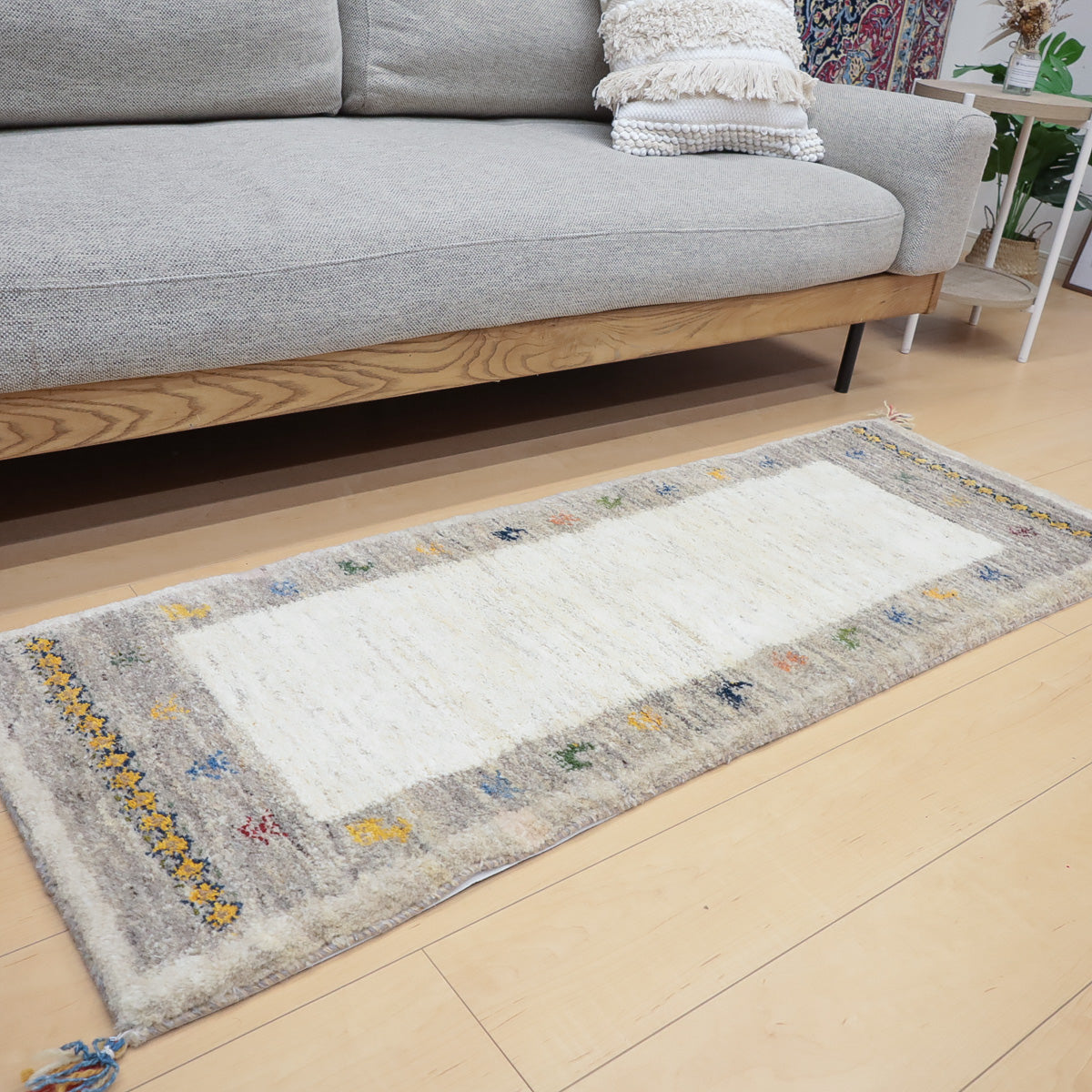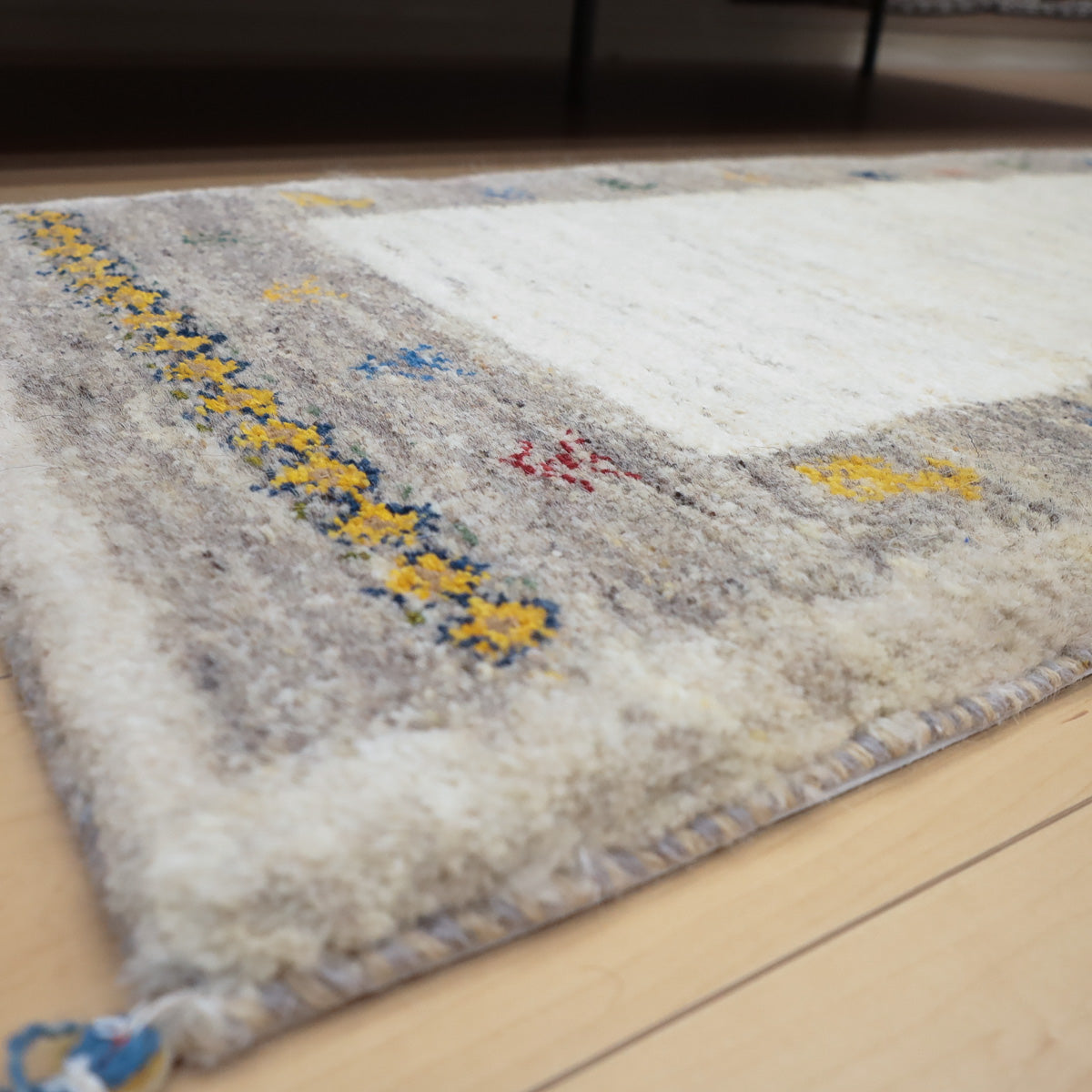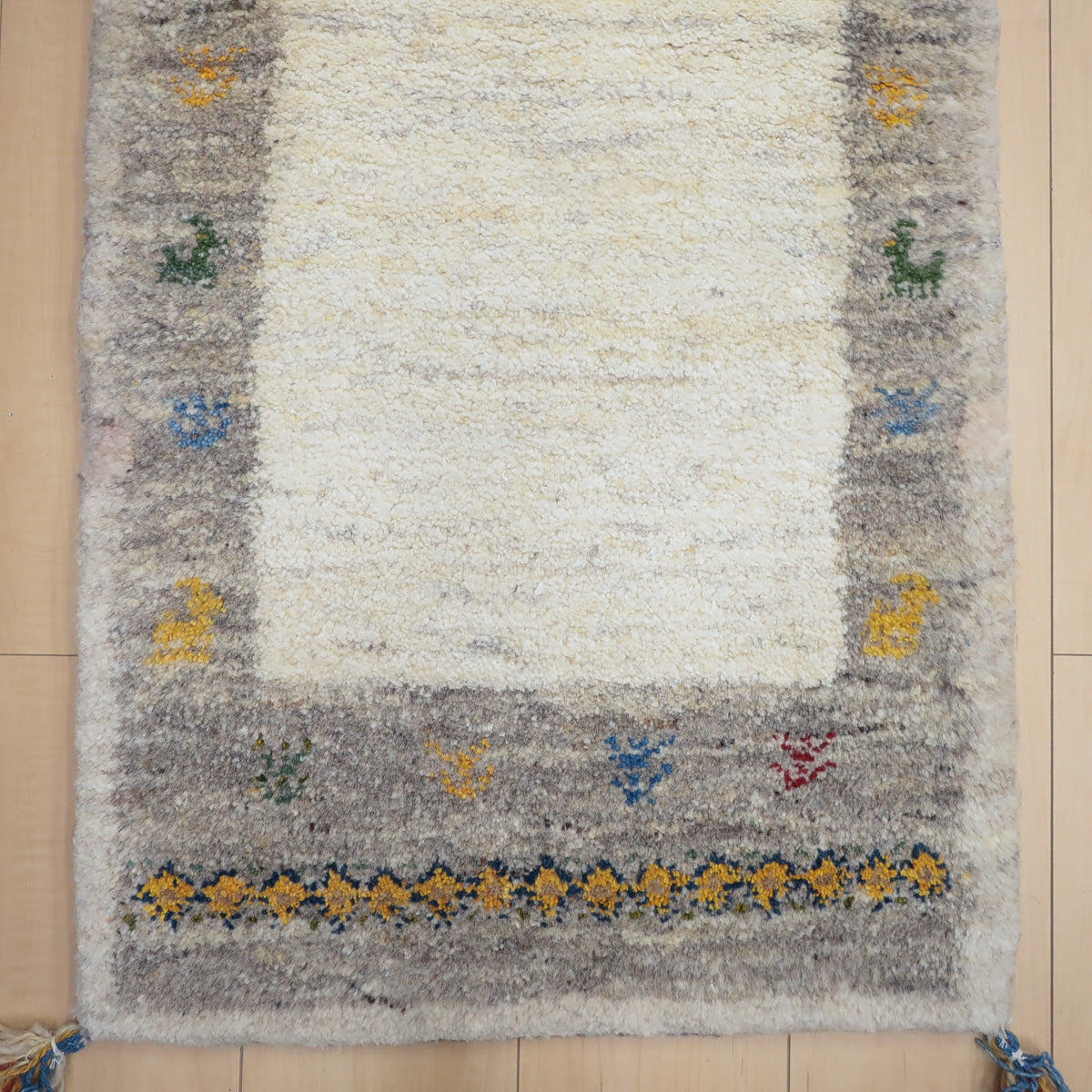 ・短辺には伝統的な連続文様が入り、ギャッベらしい素朴さと個性が楽しめます