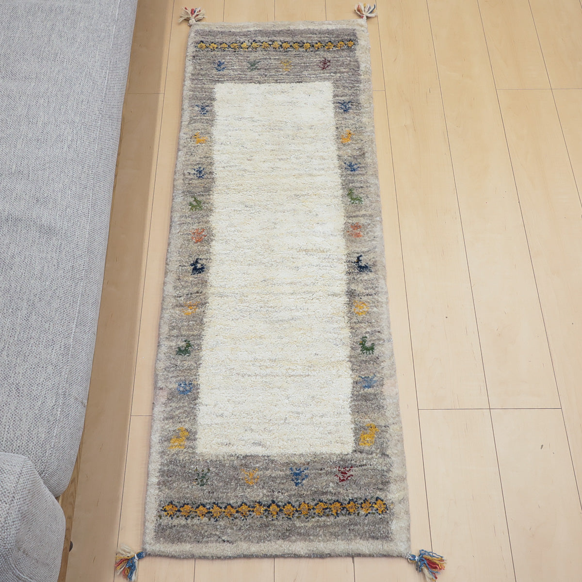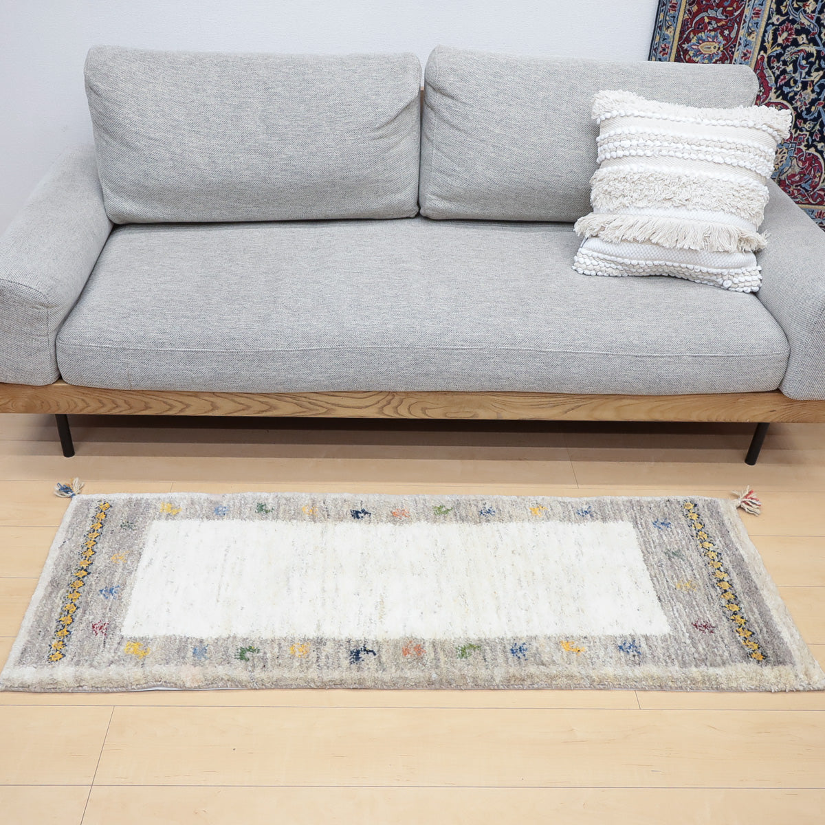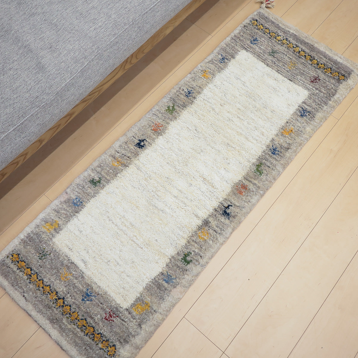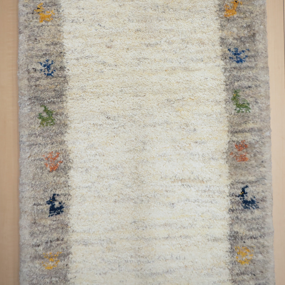 ・短辺には伝統的な連続文様が入り、ギャッベらしい素朴さと個性が楽しめます