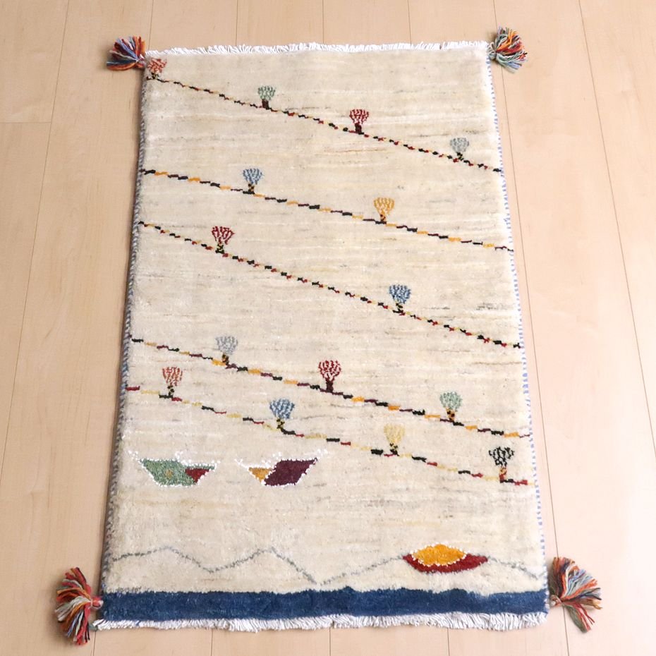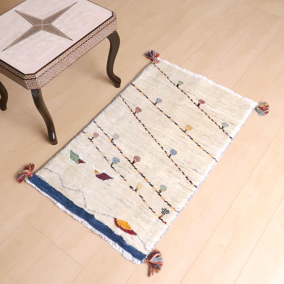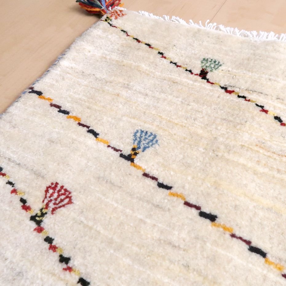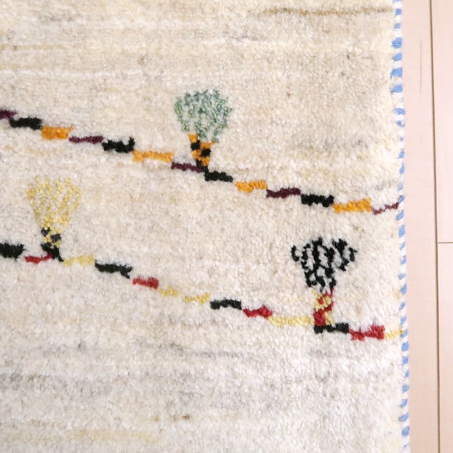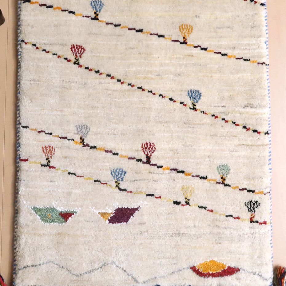 羊の毛色をそのまま活かした無染色の羊色で、ナチュラルな雰囲気がより大きく感じられます。写真は逆さまに写してしまいましたが、山並みと太陽と2つのテント、そして、いくつかの斜めのラインは、結婚式の時に飾り付けられるカラフルなライトをモチーフにしています。楽しい思い出を表したギャッベなのだと思います。デザインを引き立てるため部分的にコットンシルクが使われています。