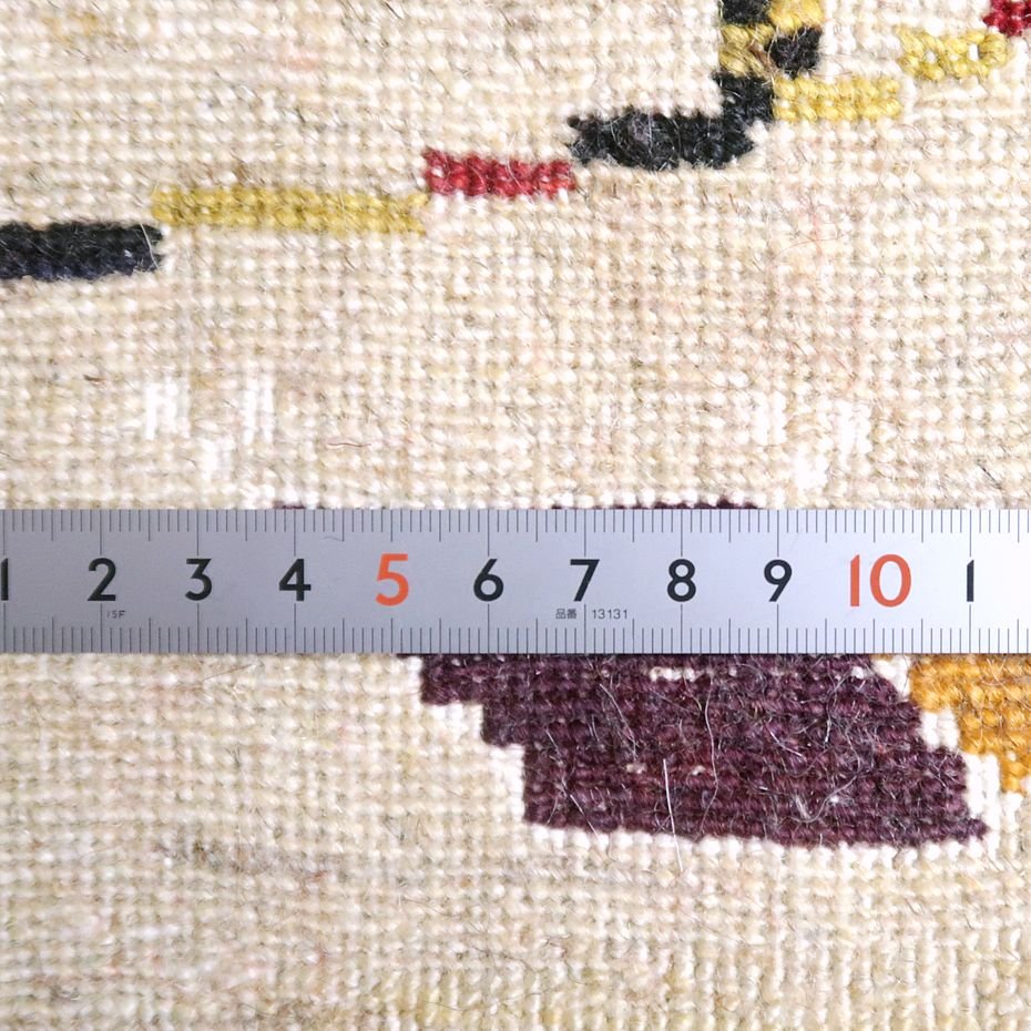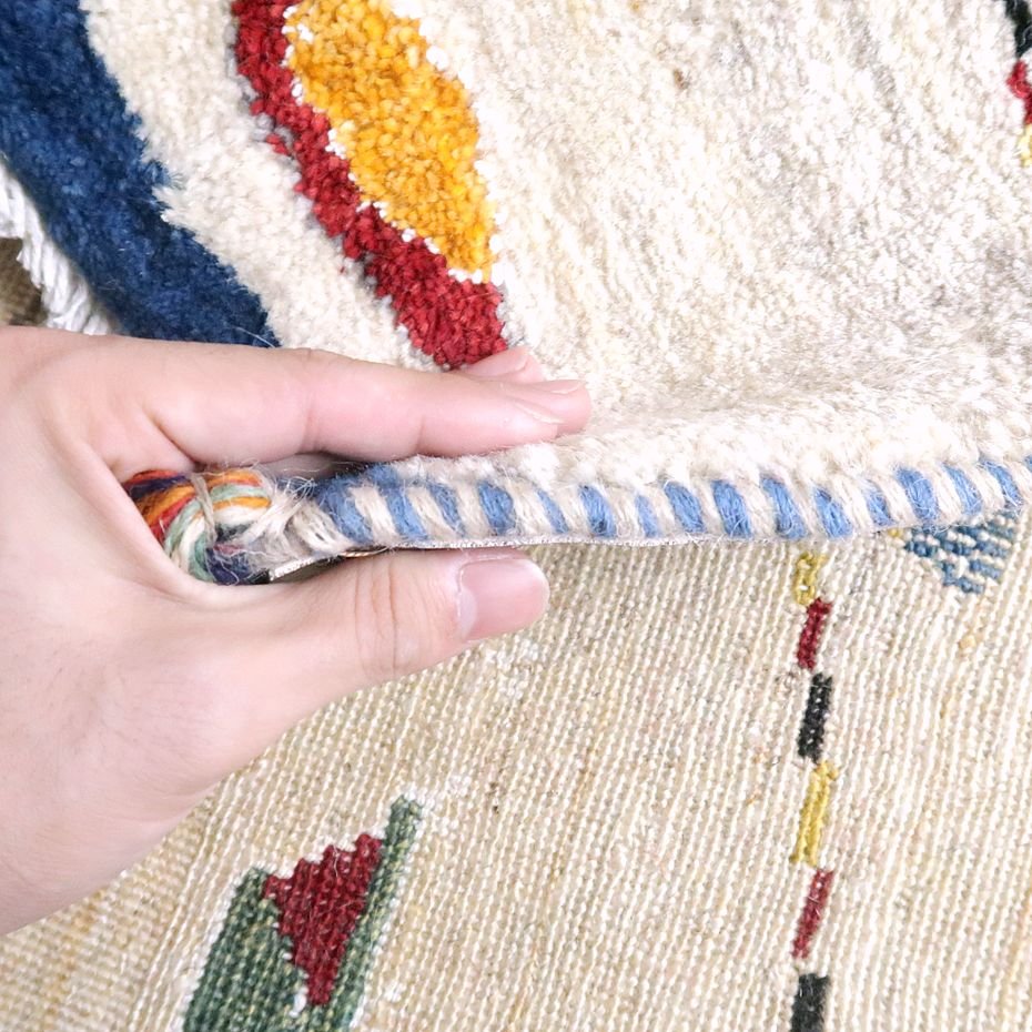 織りは、10cmあたり、およそ40から45目という普通のギャッベの数倍にもなる大変細かなルリバフ。抜け毛が少なく、手触りはふわりと柔らか。踏んだ時やんわりと沈み込む踏み心地です。腕の良い選りすぐられた織り子だけが手掛ける極上の手仕事です。