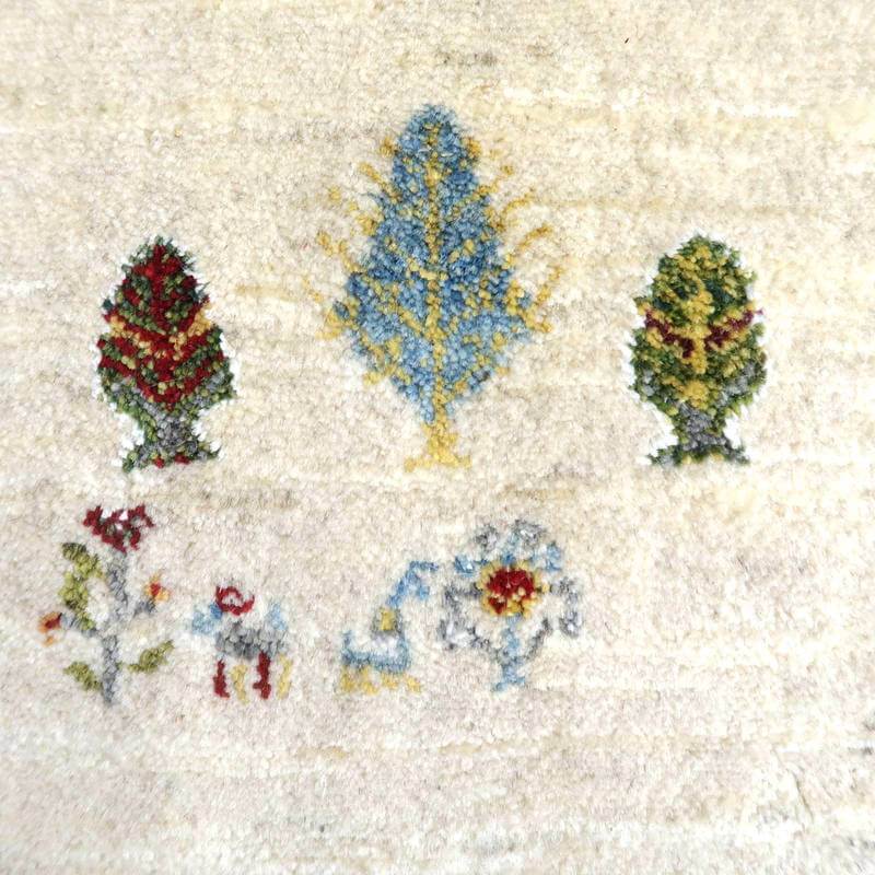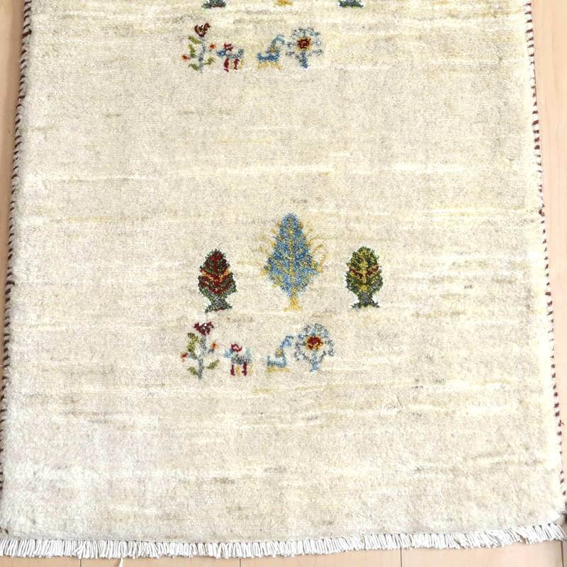 羊の毛色をそのまま活かした無染色の羊色で、ナチュラルな雰囲気がより大きく感じられます。薄グレーや薄ベージュの広がりのある景色をイメージさせるやんわりしたグラデーションに生命の木や動物が入った、絵本のような明るい雰囲気のギャッベです。