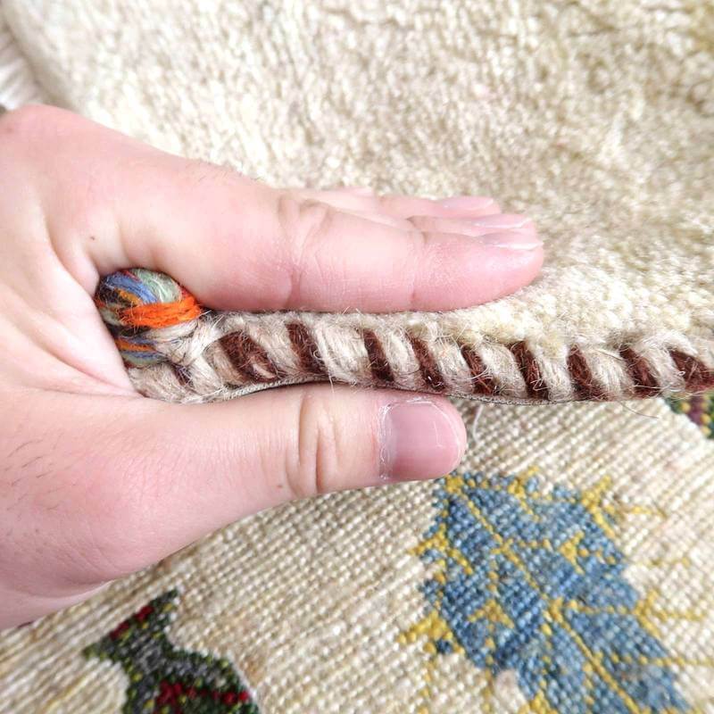 織りは、10cmあたり、およそ40から45目という普通のギャッベの数倍にもなる大変細かなルリバフ。抜け毛が少なく、手触りはふわりと柔らか。踏んだ時やんわりと沈み込む踏み心地です。腕の良い選りすぐられた織り子だけが手掛ける極上の手仕事です。