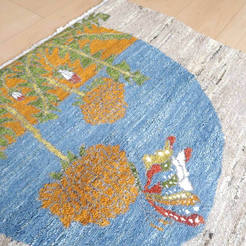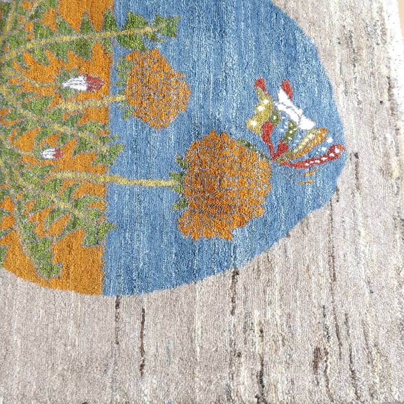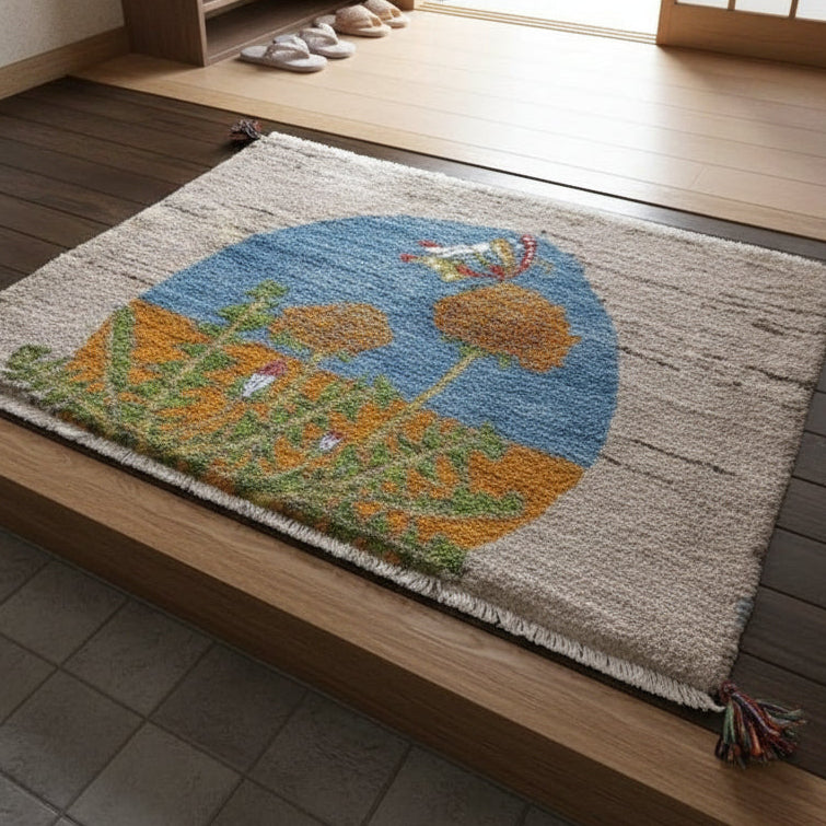 新しい季節である春を告げるタンポポにとまる蝶々の明るさと希望を感じるデザインが、望遠鏡から覗いたような構図となっています。絵のように飾って素敵なギャッベです。