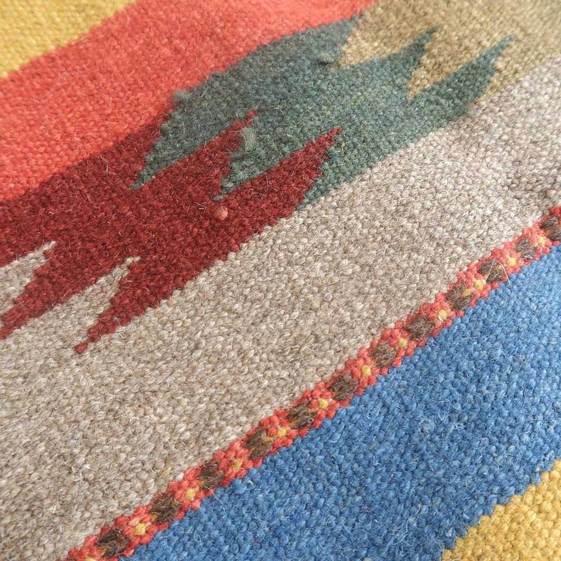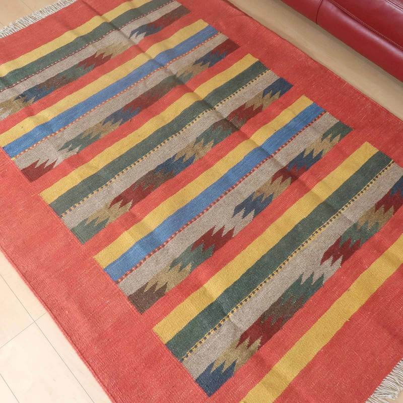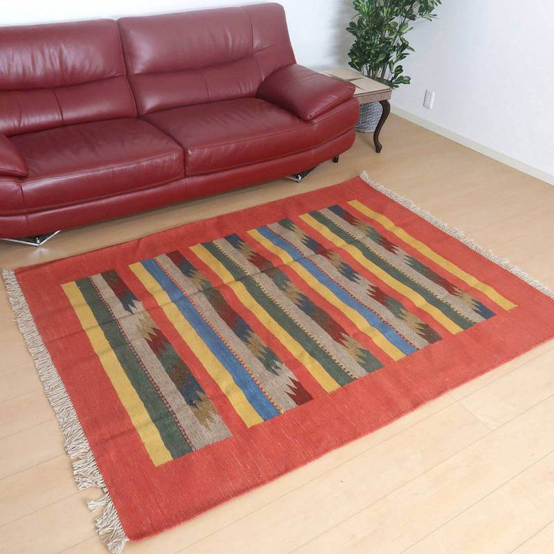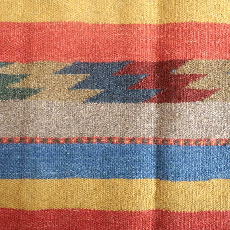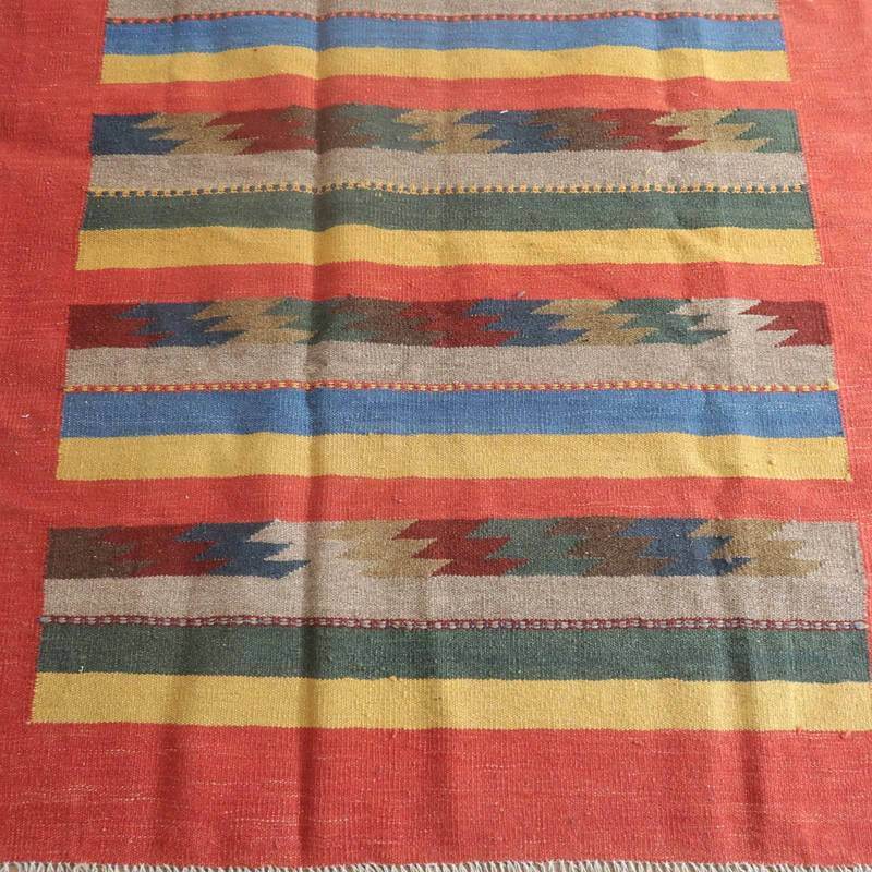 イラン南部シラーズ地方のキリムです。いくつかの色を使用した幾何学柄やギザギザ文様はリズムのある明るい雰囲気。程よく落ち着いた色とウールの風合いが、やさしくインテリアに馴染みます。カシュガイの女性が昔ながらに織り上げたキリムなので、よく締まった丈夫な織り目で、早く仕上げる為、ゆるく粗く織られる商用生産のキリムには無い、誠実さが伝わってくる一枚です。また、平織り(ひらおり)という裏表の無い織り方で両面使えます。カシュガイ族の遊牧のテント生活用の為、丈夫に織られ、洗濯も簡単、床なじみの良い適度な厚さで、普段使いのラグとして大変使いやすいキリムです。
